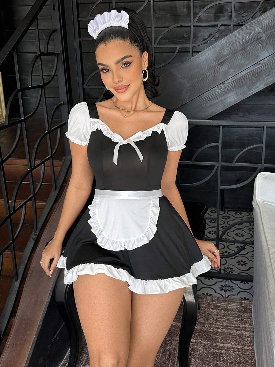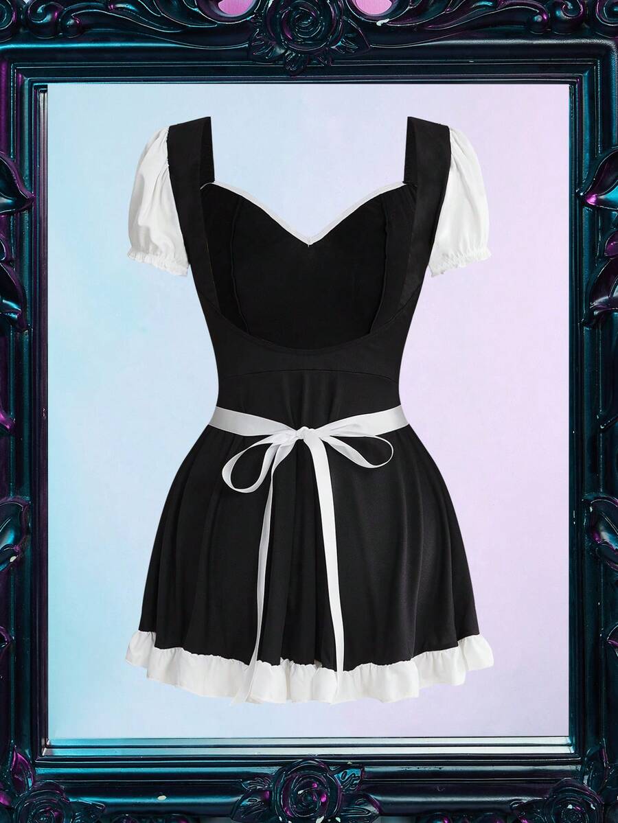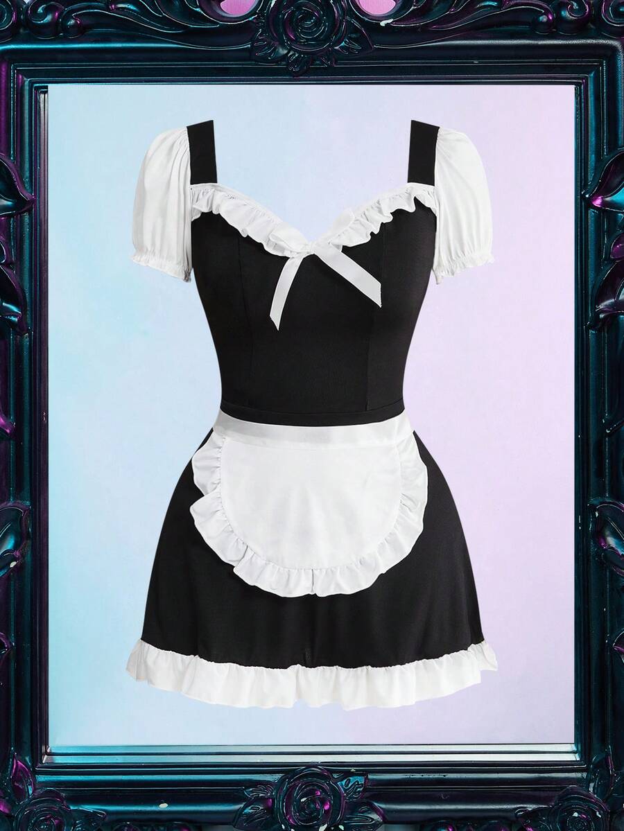 2pcs Women Maid Costume Lingerie Dress With Bow Decor And Apron