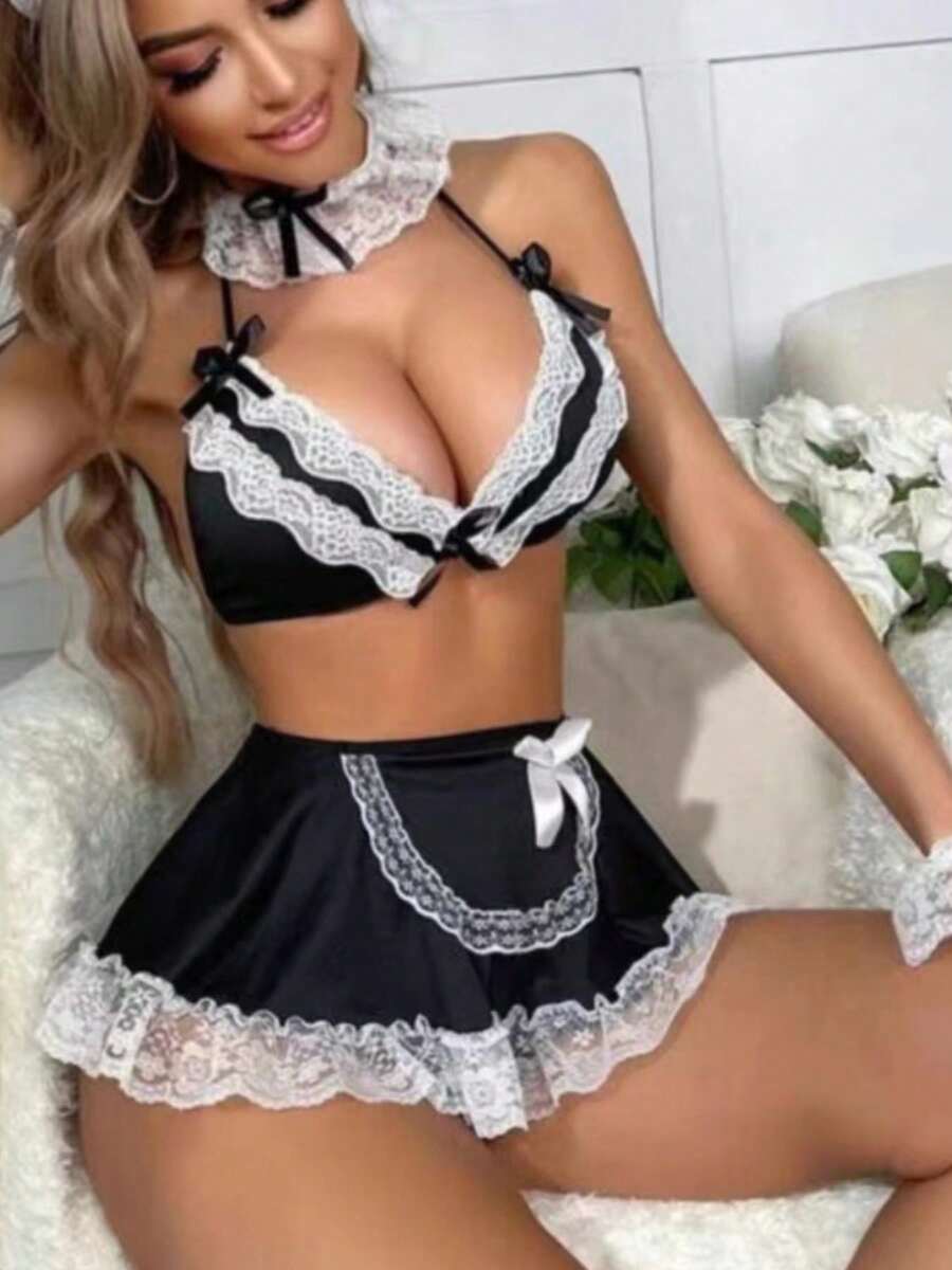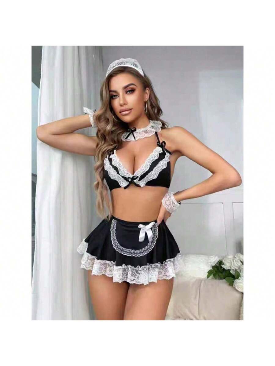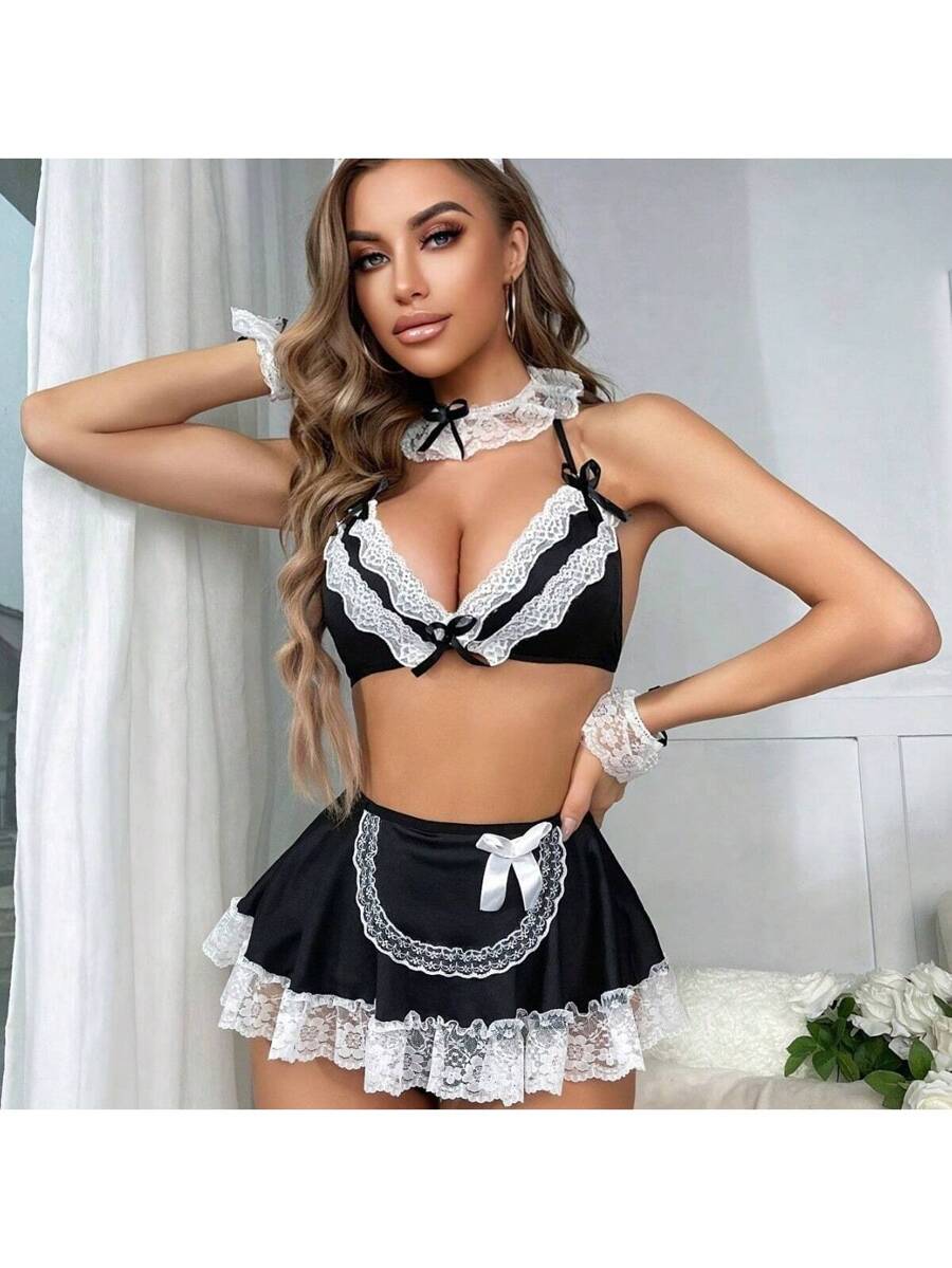 Women's Maid Lingerie Set, Strapless Bra, Thong, Short Skirt, Wristband, Doll Nightgown