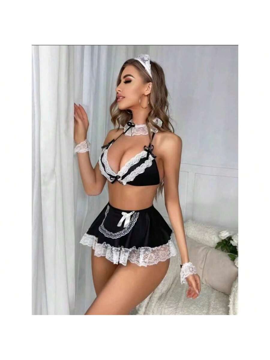Details: Bow. Details: Backless. Details: Sheer. Pattern Type: Plants. Style: Sexy Cos. Straps Type: Adjustable Straps. Color: Black. Neckline: Halter. Number of Pieces: 5 Piece Set. Fit Type: Regular Fit. Sheer: No. Scenes: Sexy Cos.