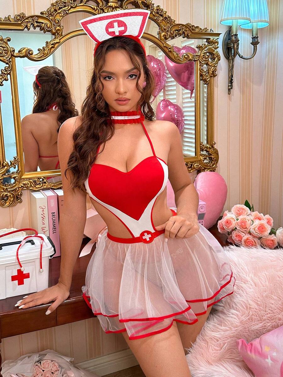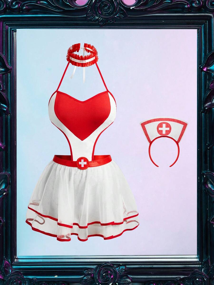 Oversized Heart Nurse Uniform Double-Layer Cake Skirt, Romantic Valentine's Day Gift For Bar, Party, Masquerade, Women's Costume