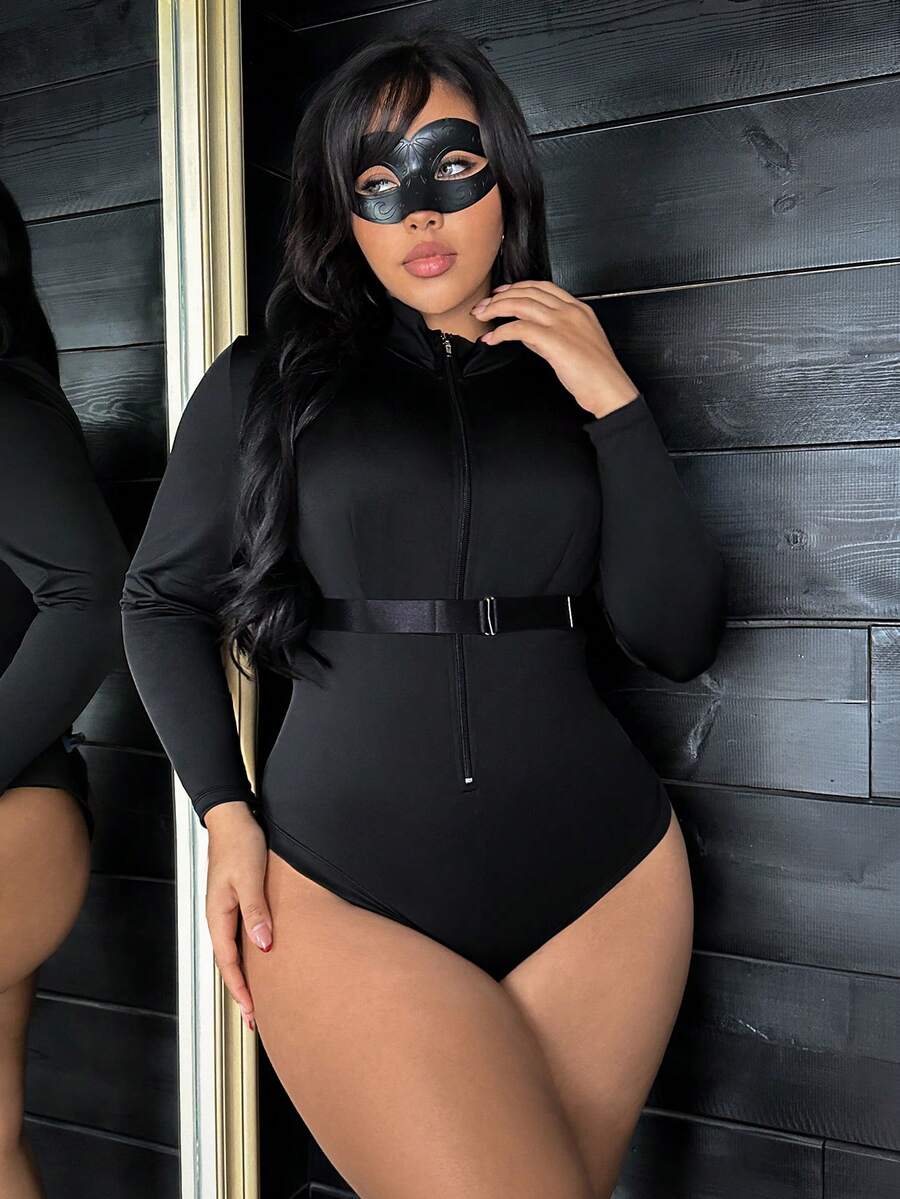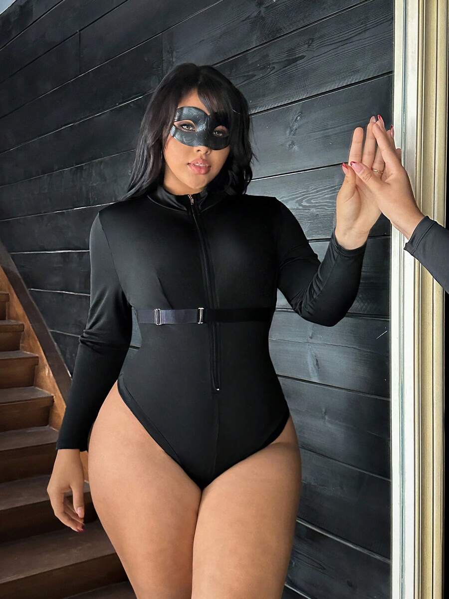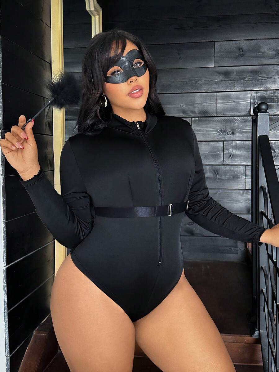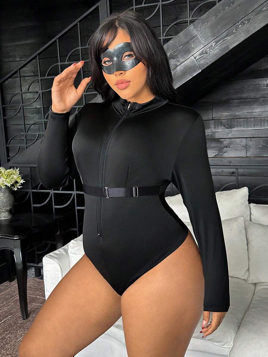 2pcs Black Superhero Cosplay Zipper Mask Jumpsuit, Charming Personalized Plus Size Lingerie