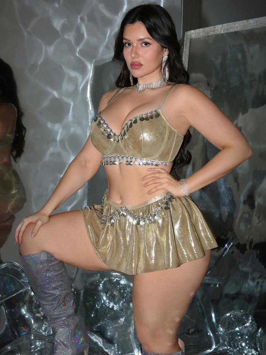 2pcs Plus Size Women Metallic Sequin Trim Lingerie Set