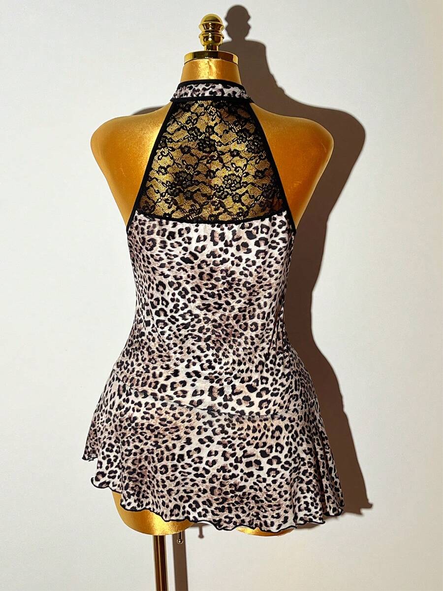 2pcs Plus Size Women Sexy Lace Chiffon Leopard Print Ruffle Hem Bodycon Dress Set