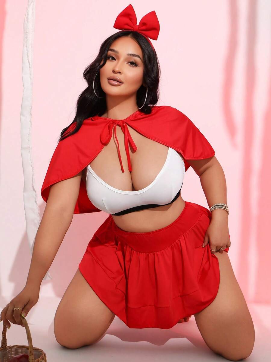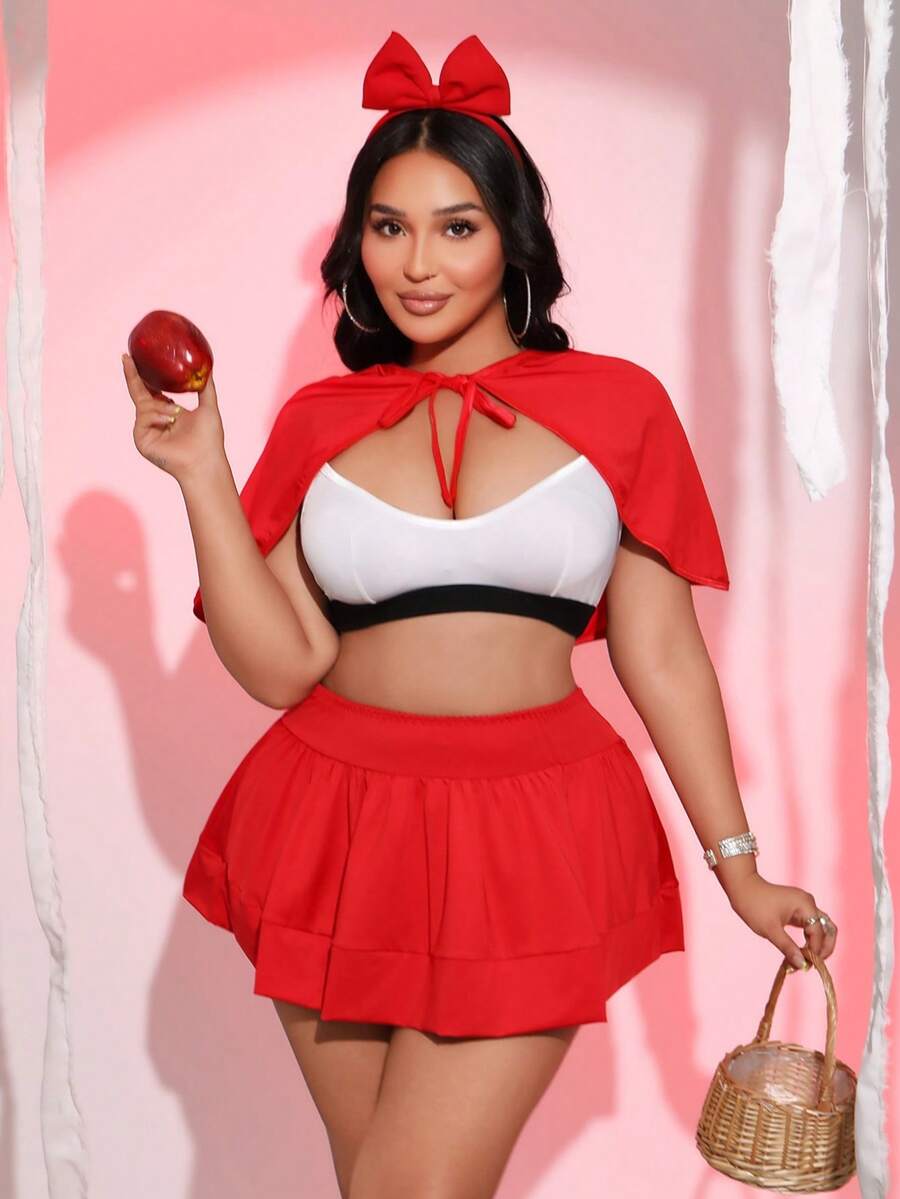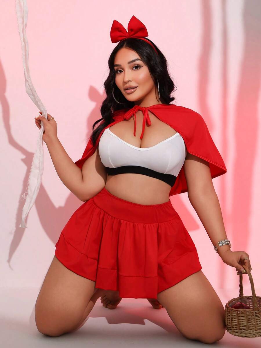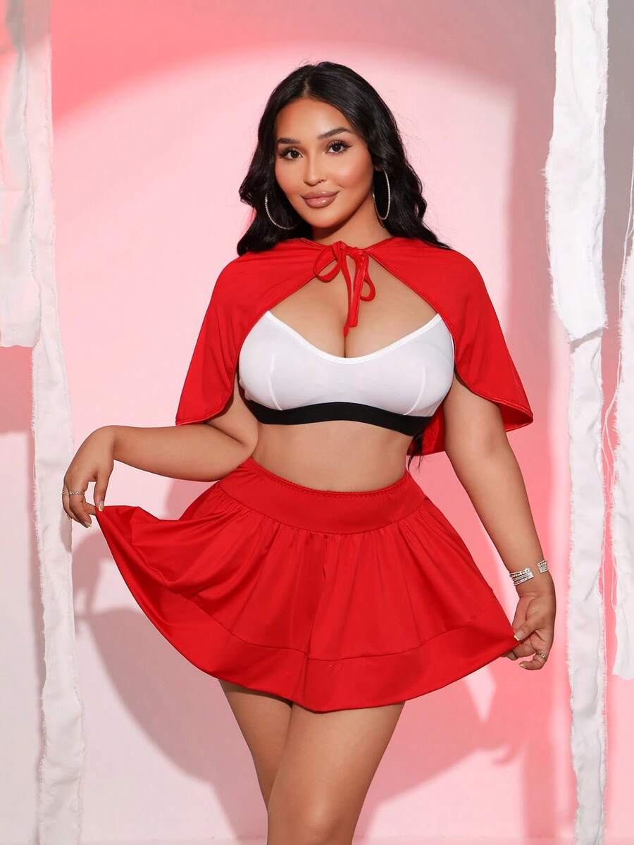 3pcs Halloween Little Red Riding Hood Cosplay Ruffled Low-Cut Sexy Charm Cloak Mini Skirt Lingerie Set, Plus Size Costume For Party, Music Festival, Role Play