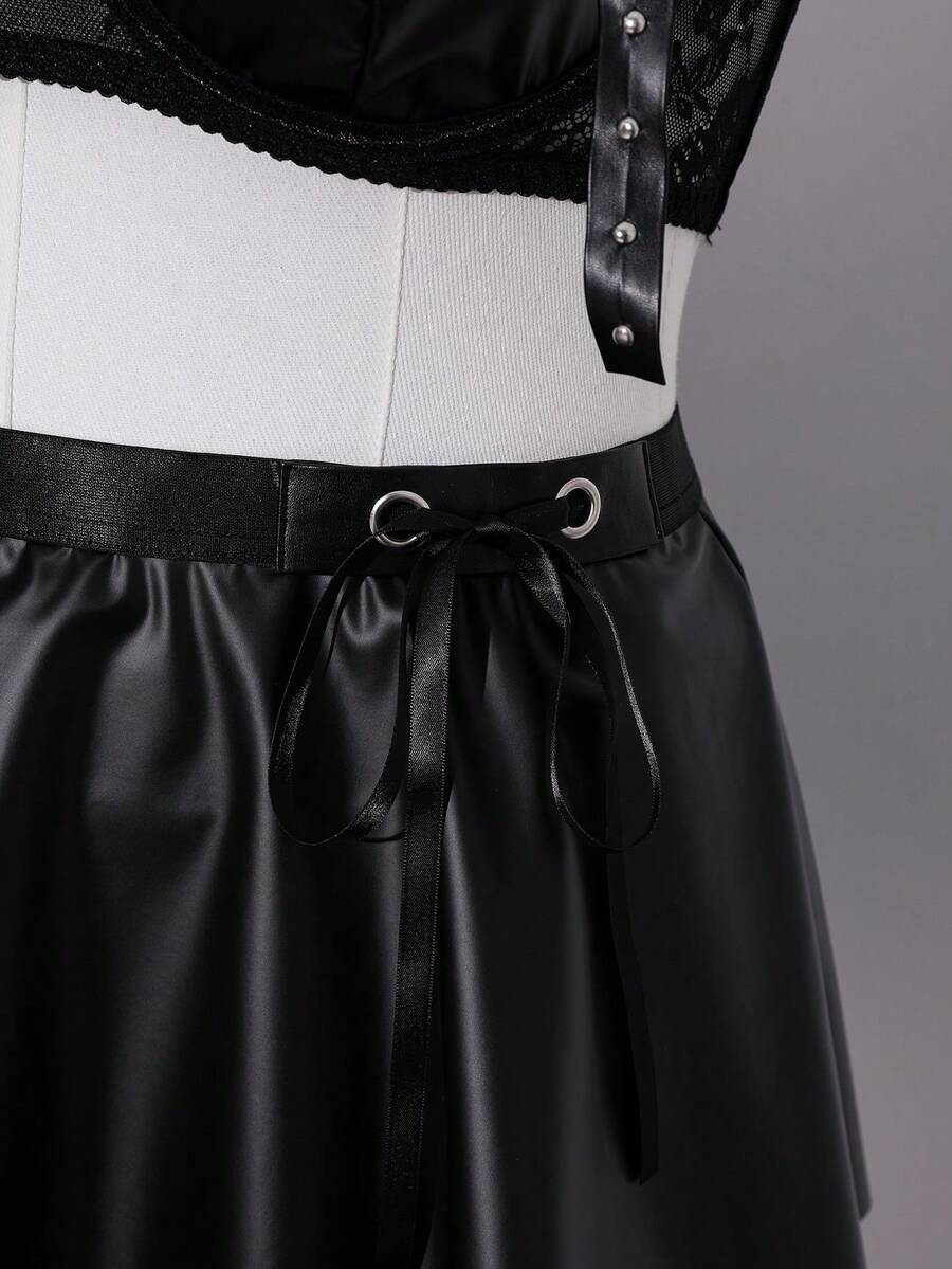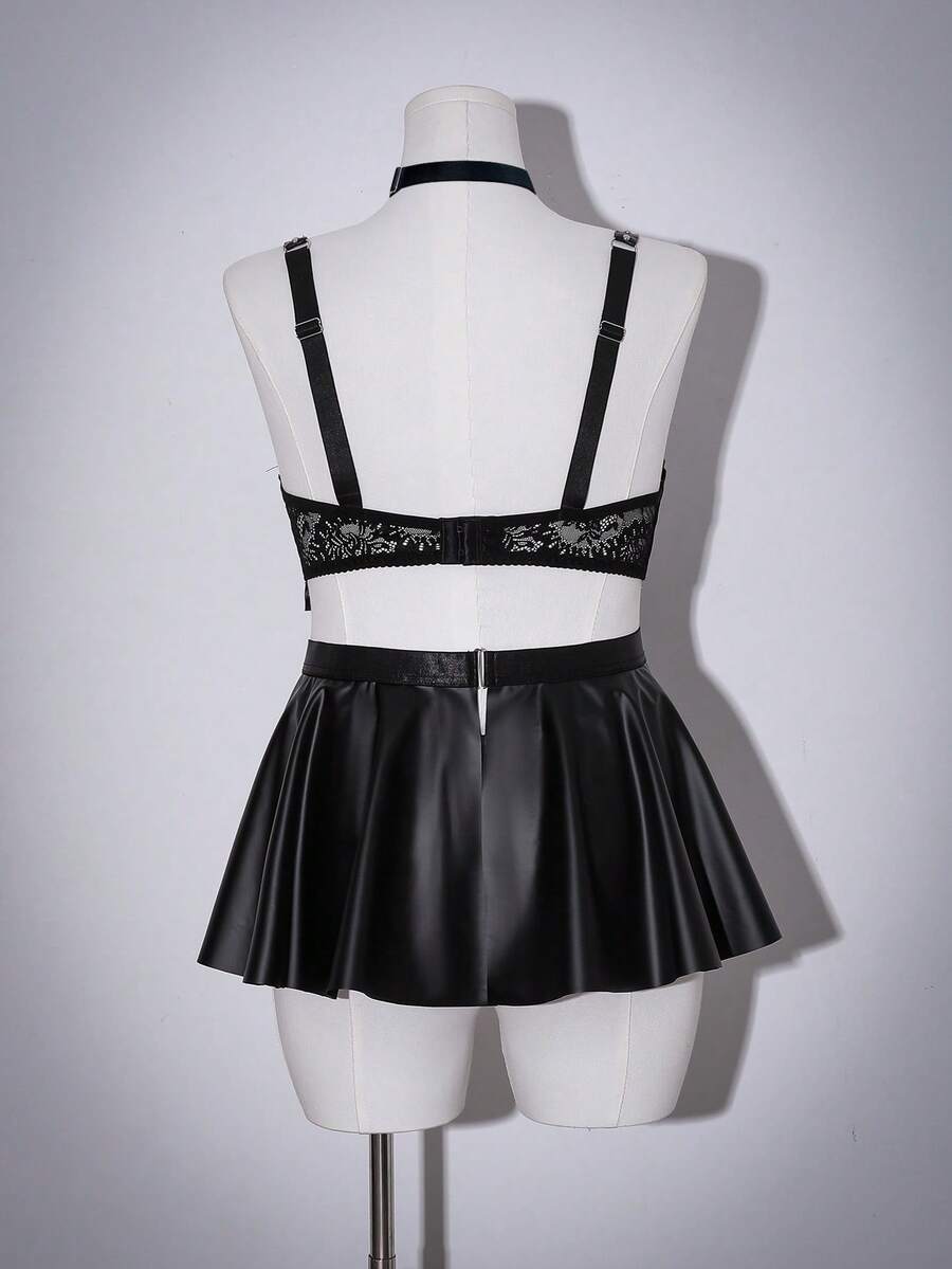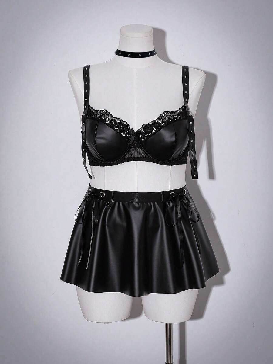 4pcs Set: Dark Pu Leather Flared Mini Skirt, Rivet Bow Decor Sexy Lingerie For Women