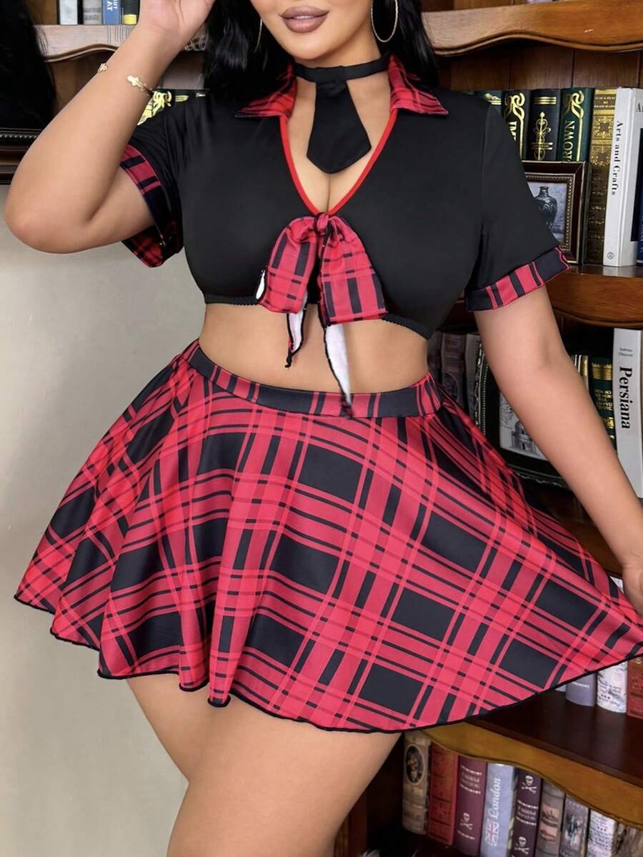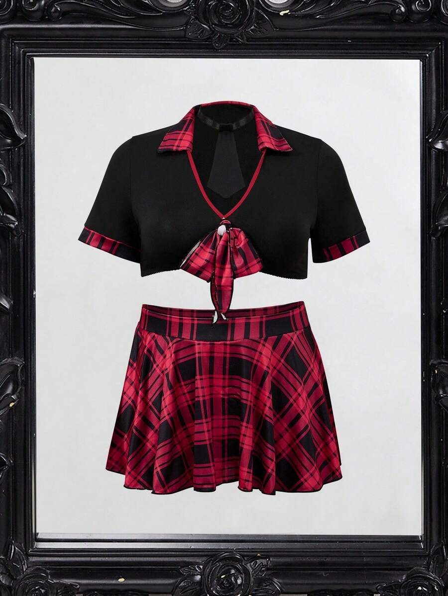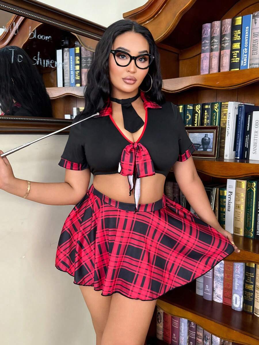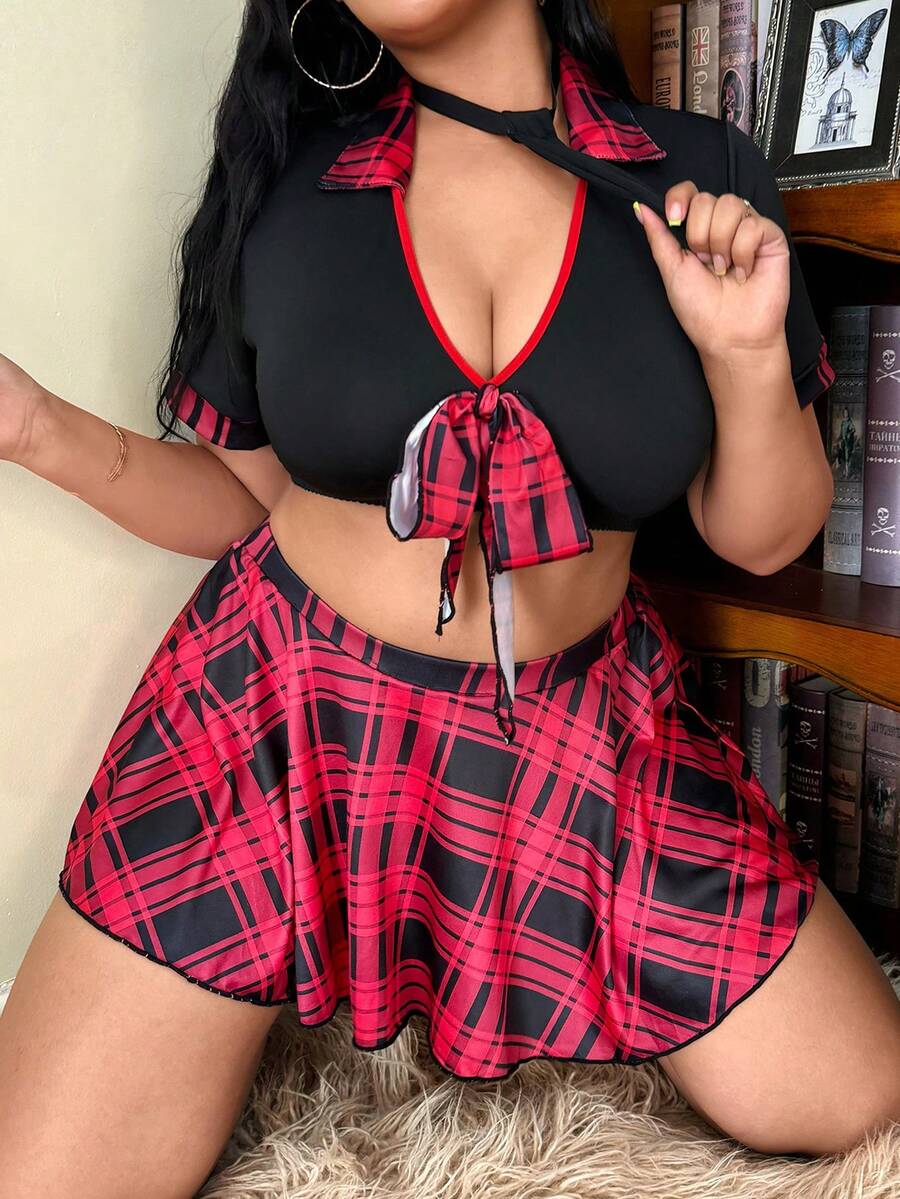 4pcs Set: Plaid Print High Elasticity Milk Silk Sexy V-Neck Bowknot Skirt, Plus Size Lingerie Costume