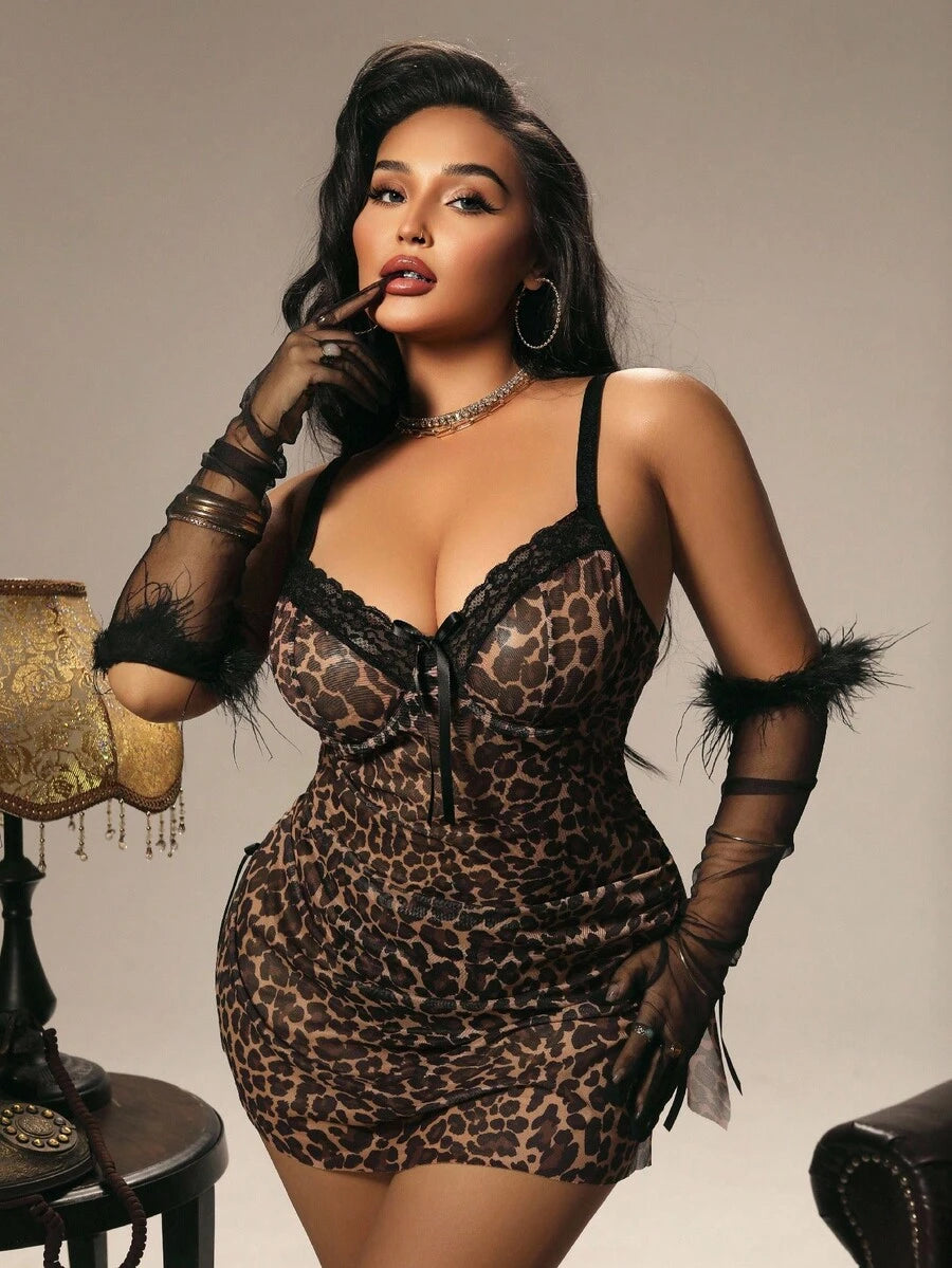Bare Chapter 2pcs/Set Plus Size Women Sexy Leopard Print Mesh Lace Ruffle Slit Skirt Set