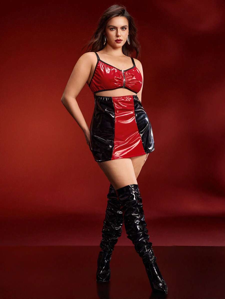 Plus Size Sexy Bodystocking With Zipper, Patchwork, Coated, Reflective Details, Slimming Effect, Black
