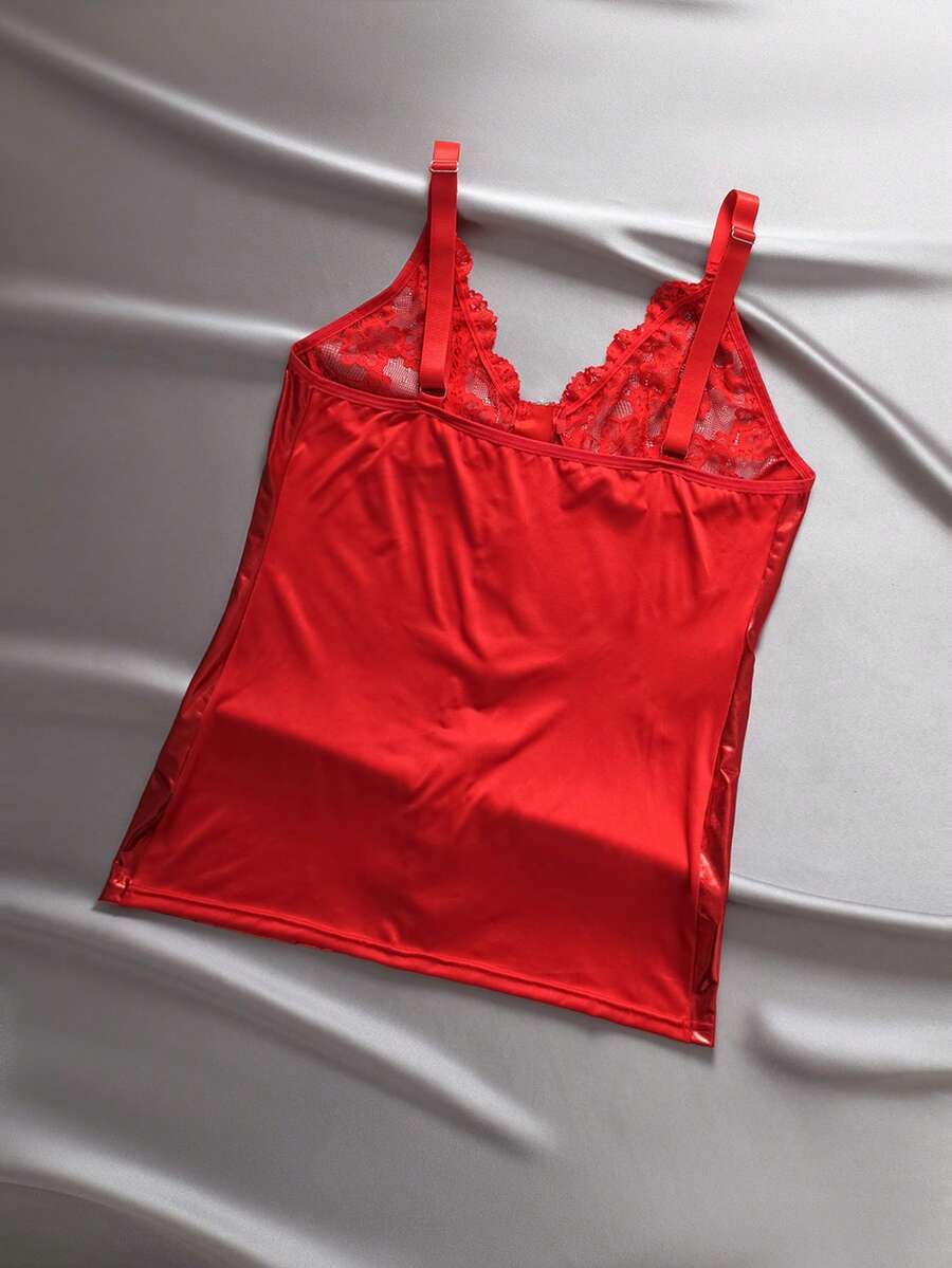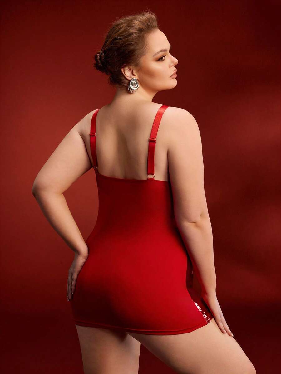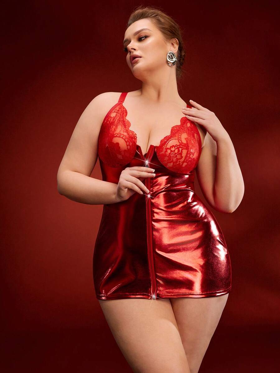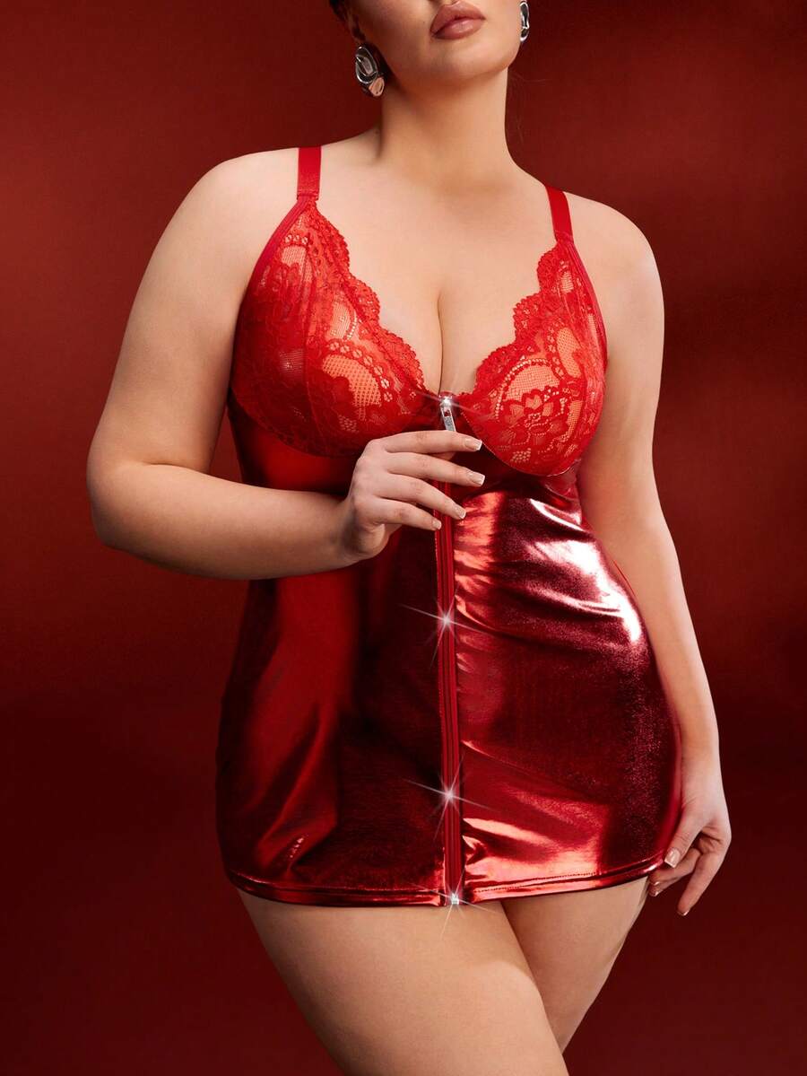 Plus Size Sexy Lace Patchwork Reflective Zipper Bodysuit, Slimming Effect, Red Club Outfit For Party, Music Festival, Spaghetti Strap Dress, Can Be Worn Outdoors
