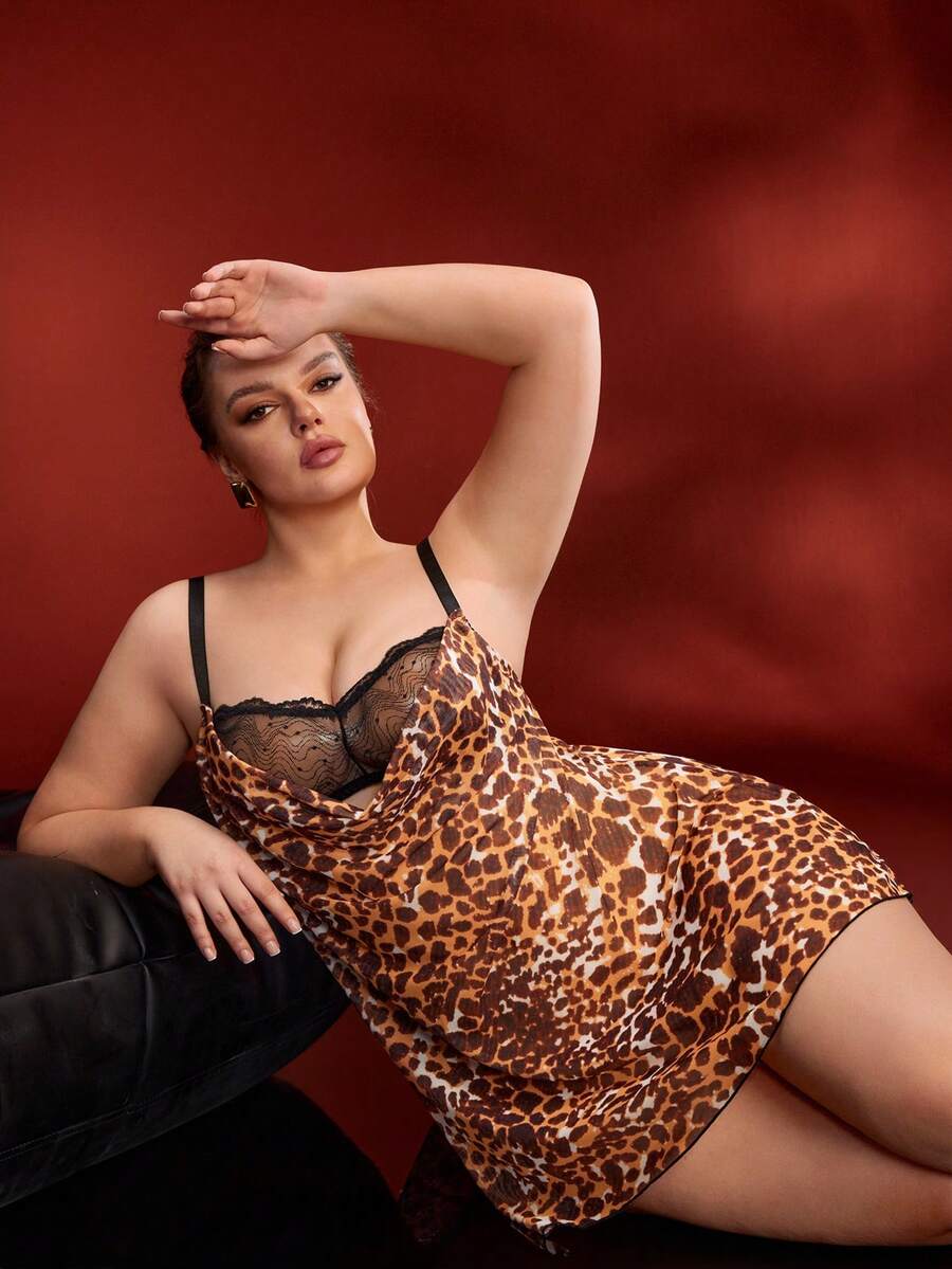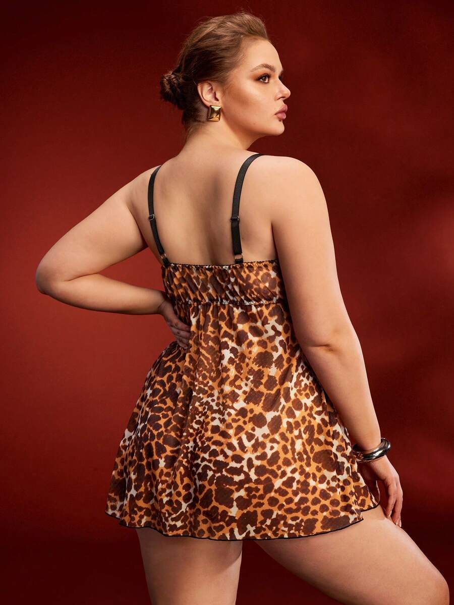 Plus Size Sexy Lingerie Dress With Lace Patchwork, Leopard Print, Plunging Neckline, Waist Cinching Design, Mesh Inserts