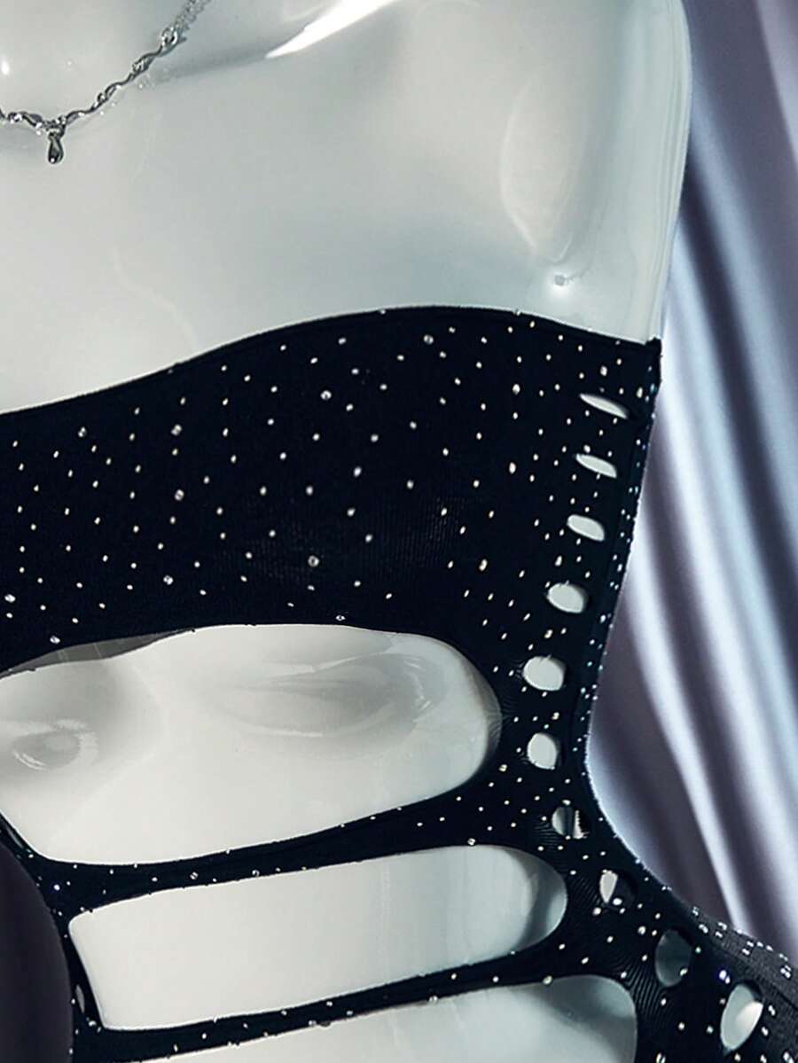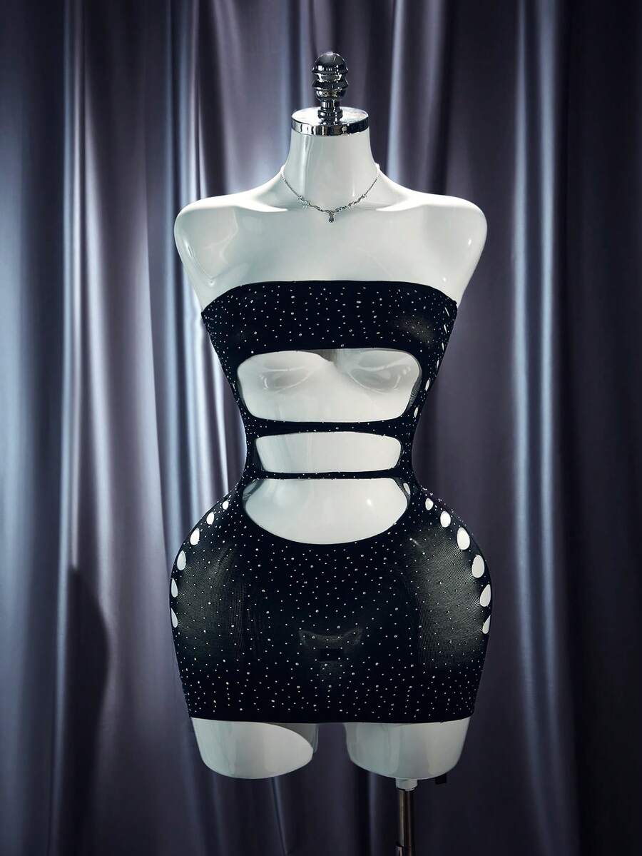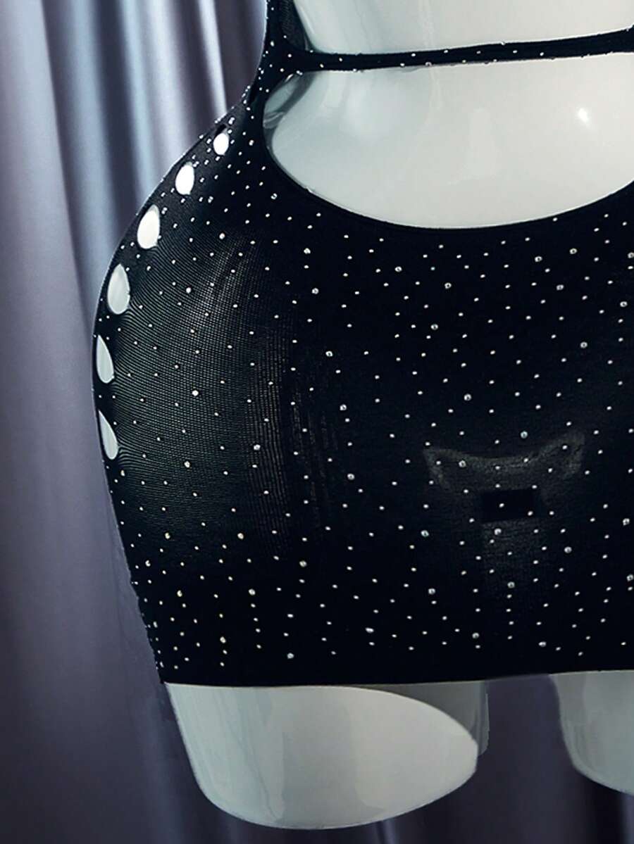Plus Size Midnight Glam Fishnet Lingerie, Hollow-Out Design With Rhinestone Elements, Suitable For Theme Party
