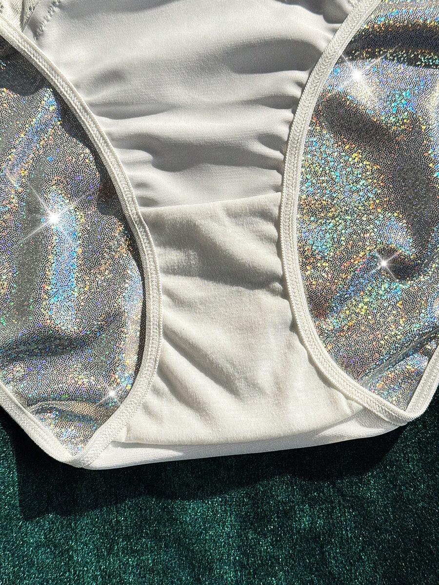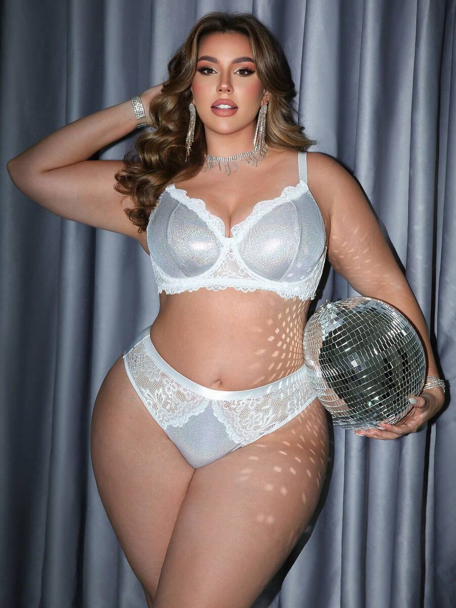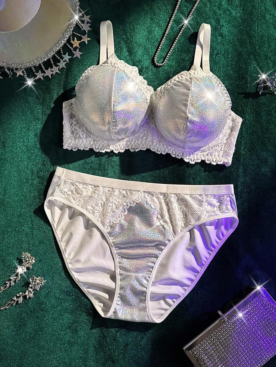 Plus Size Glamorous Series Reflective Fabric Contrast Lace Underwire Lingerie Set, Lingerie For Women, Sexy, Valentine's Day, Wedding