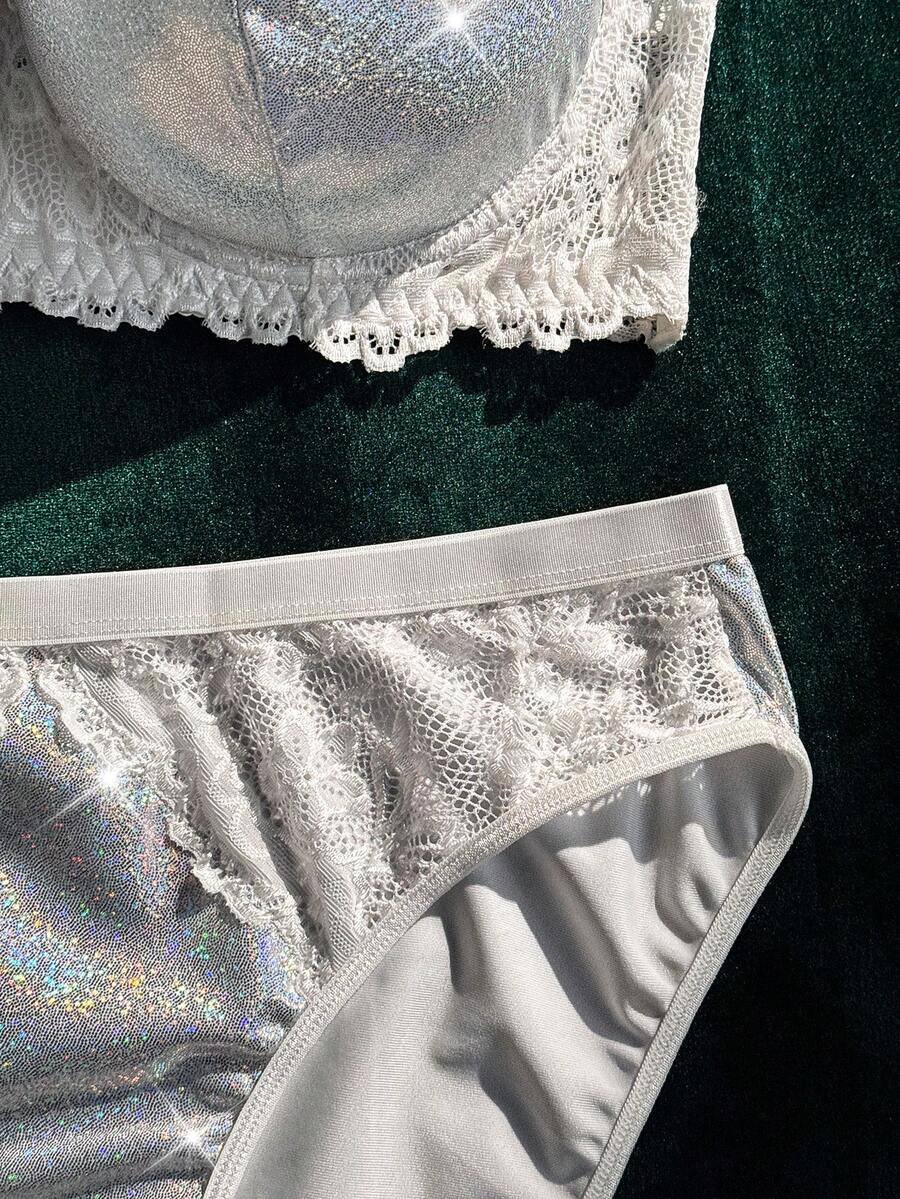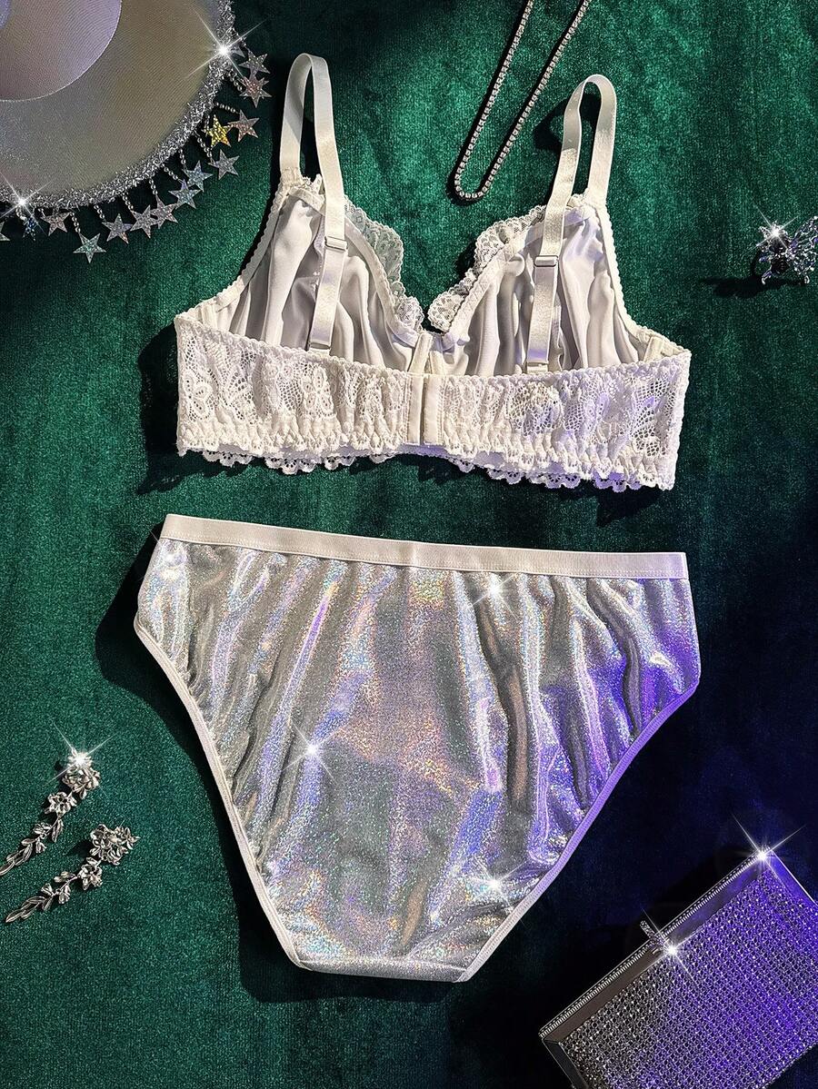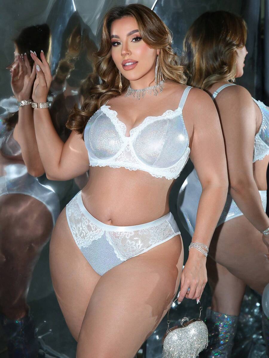 Plus Size Glamorous Series Reflective Fabric Contrast Lace Underwire Lingerie Set, Lingerie For Women, Sexy, Valentine's Day, Wedding