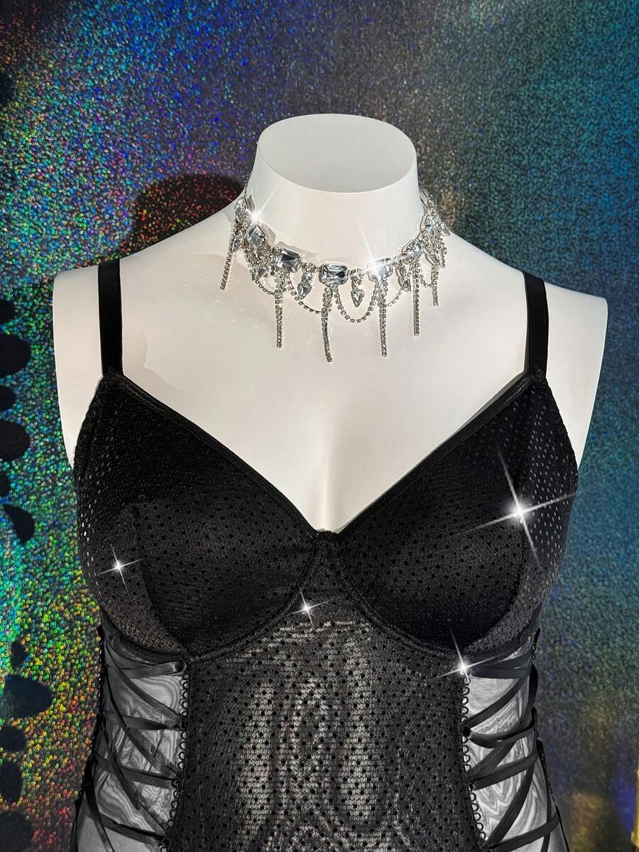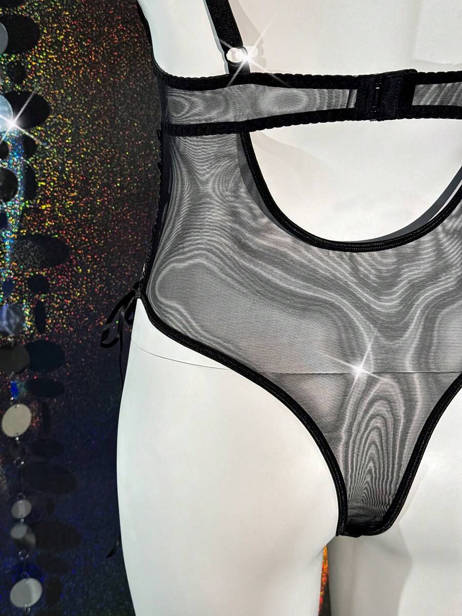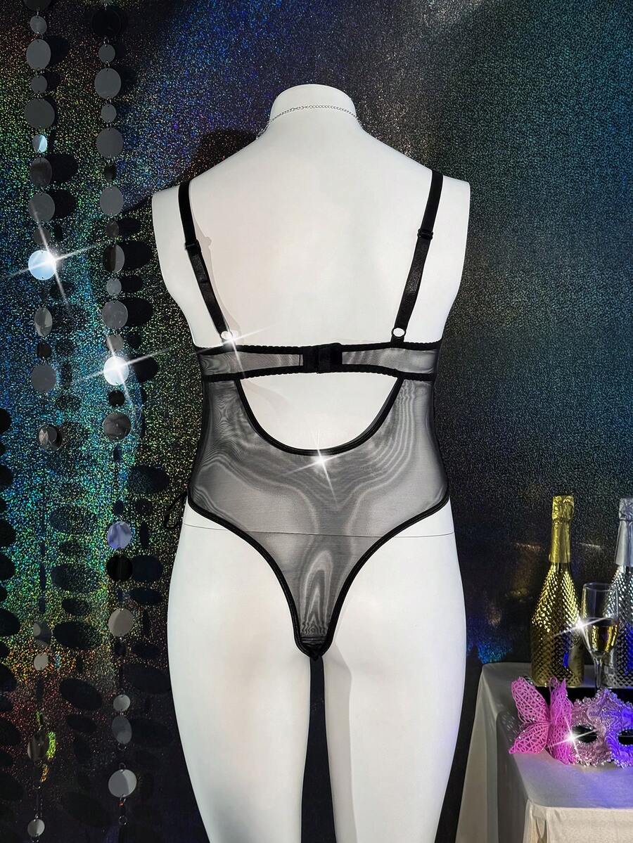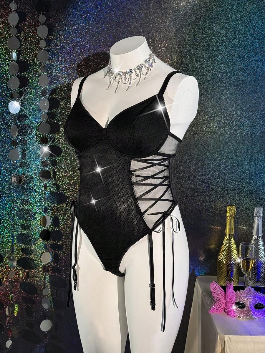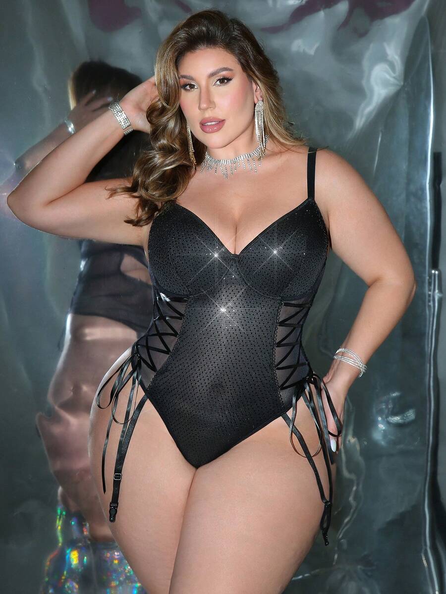 Plus Size Glamorous Series Reflective Material Patchwork Sheer Mesh Drawstring Design Underwire Bodystocking, Lingerie For Women, Sexy, Valentine's Day, Wedding