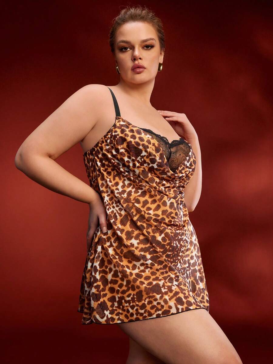 Plus Size Sexy Lingerie Dress With Lace Patchwork, Leopard Print, Plunging Neckline, Waist Cinching Design, Mesh Inserts