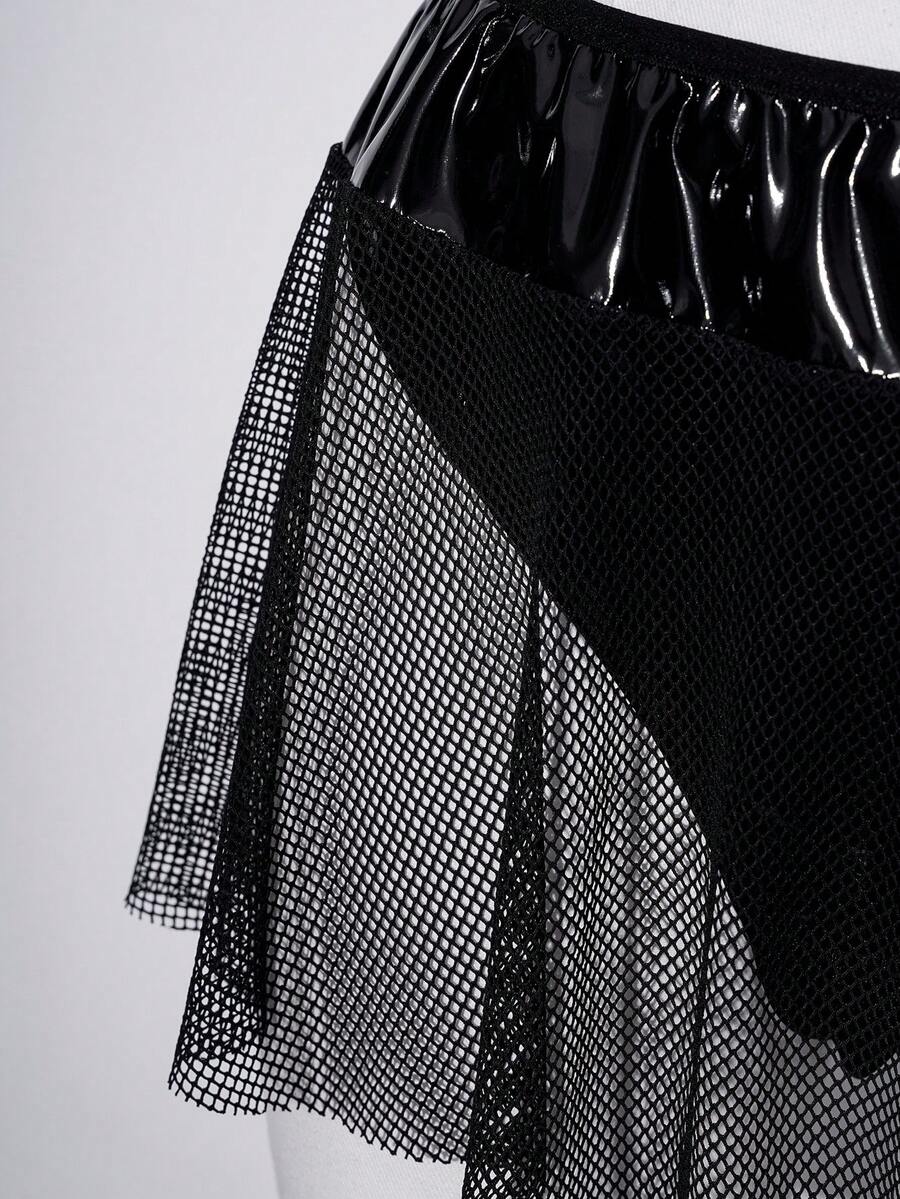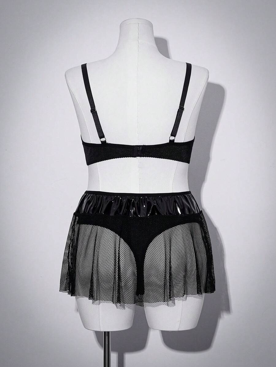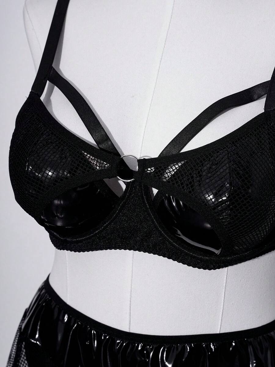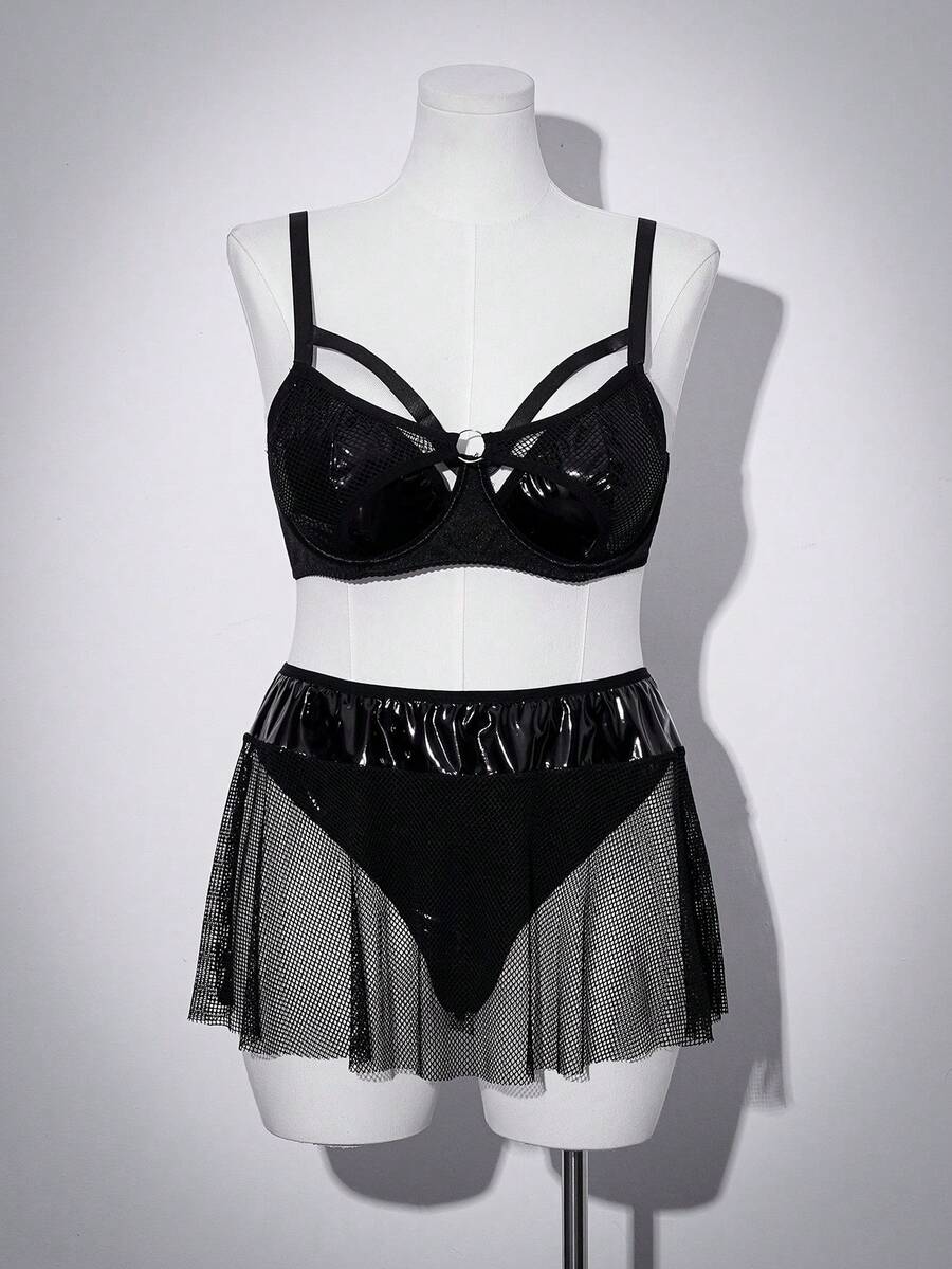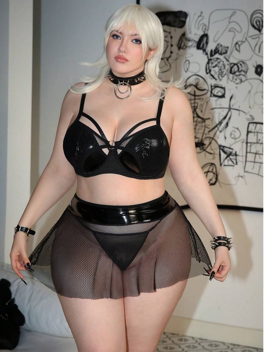 Plus Size Women Sexy Punk Style Faux Leather Fishnet Hollow Out Lingerie A-Line Dress 3-Piece Set