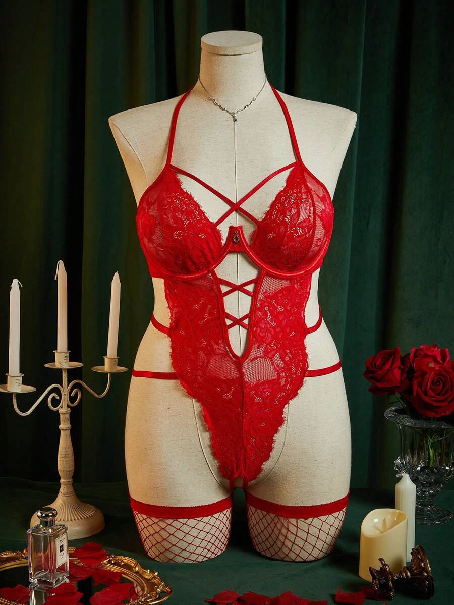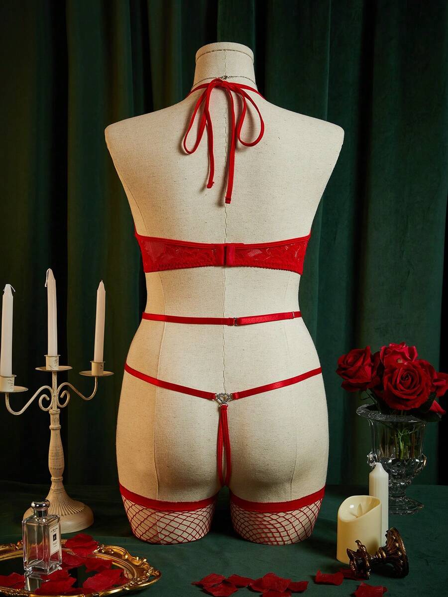 SpicyHot 3pcs Set Lace Sheer Deep V Halter Backless Sexy Jumpsuit Lingerie Set