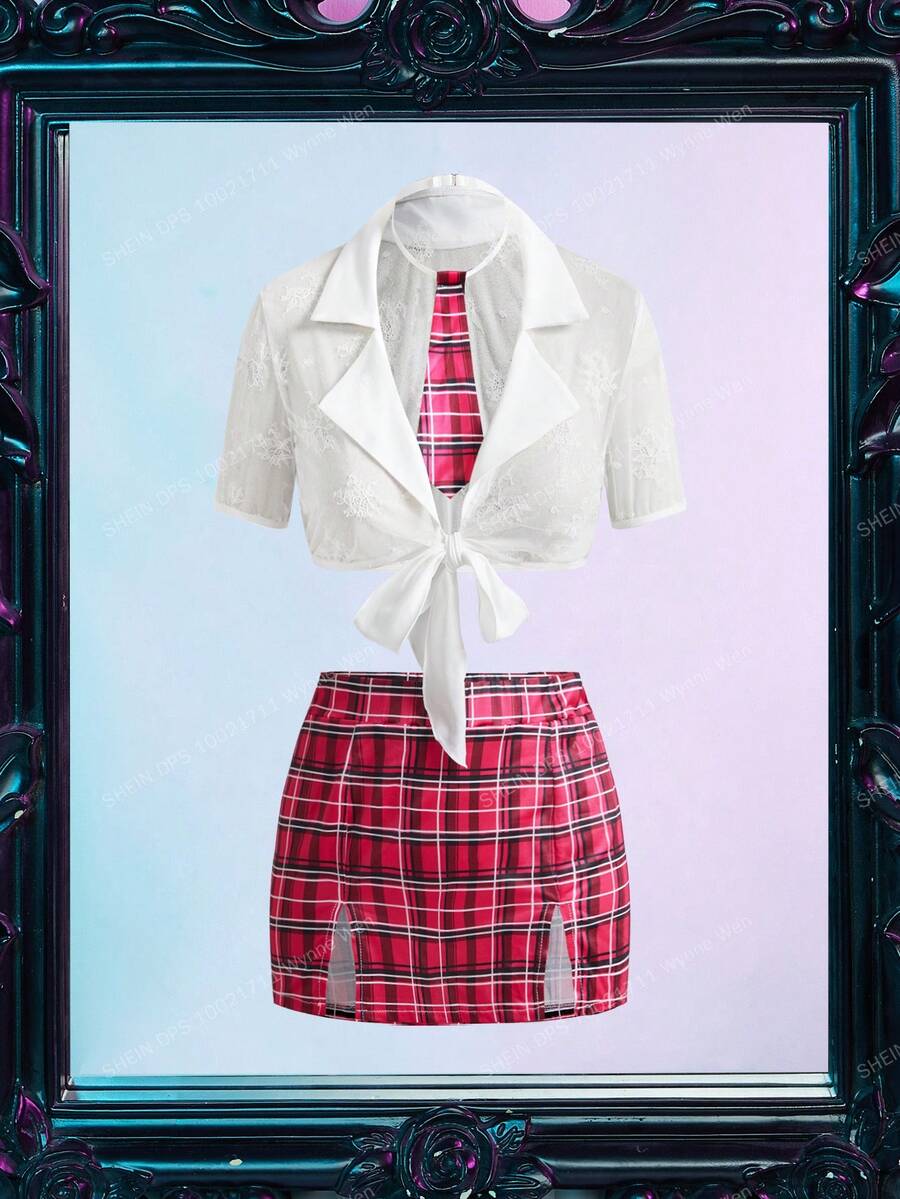 4pcs Plus Size Lace Plaid Sexy Lingerie Set, For Students