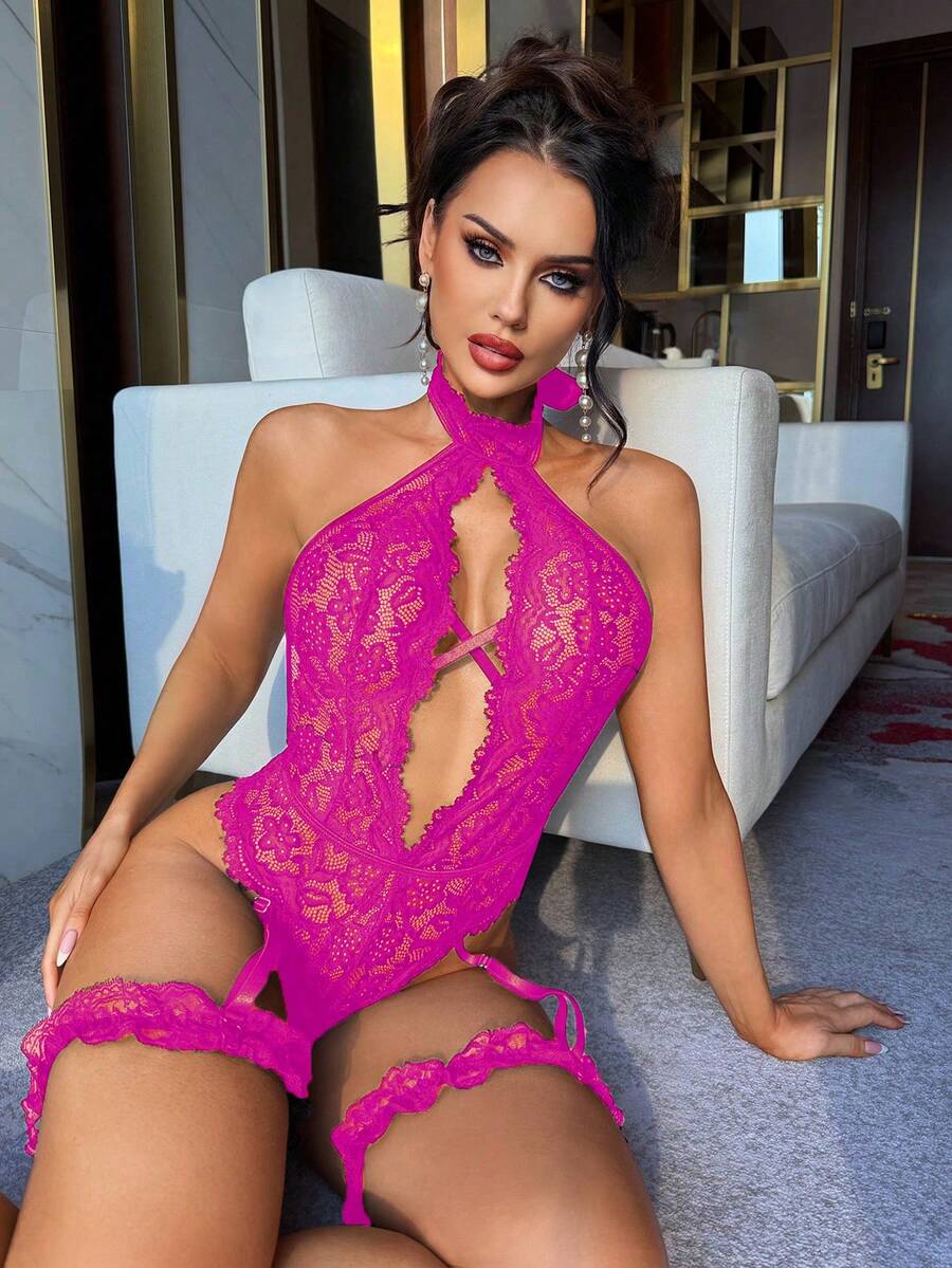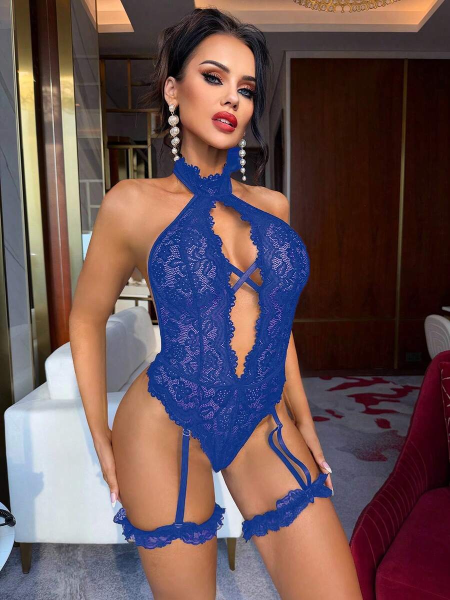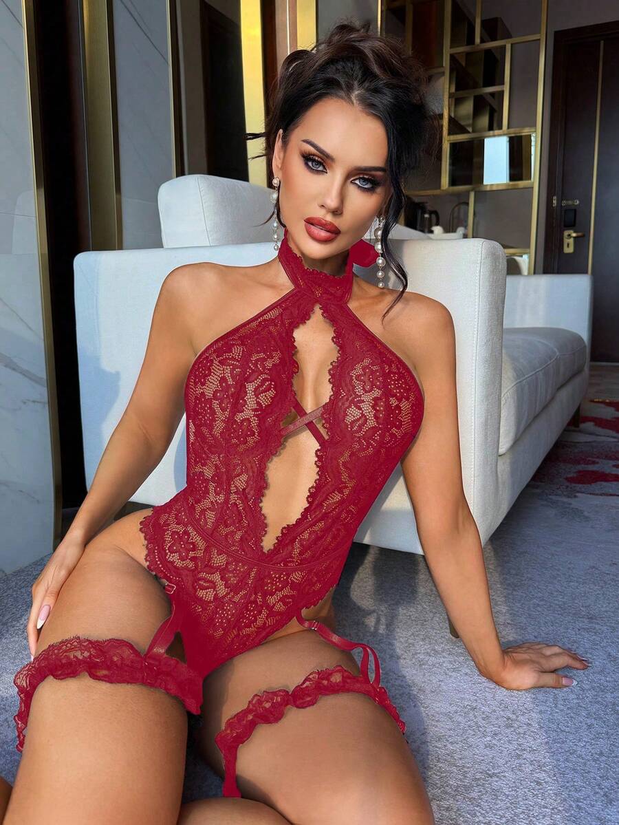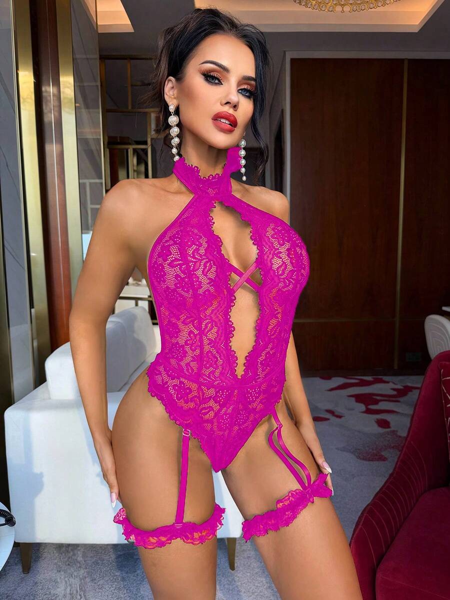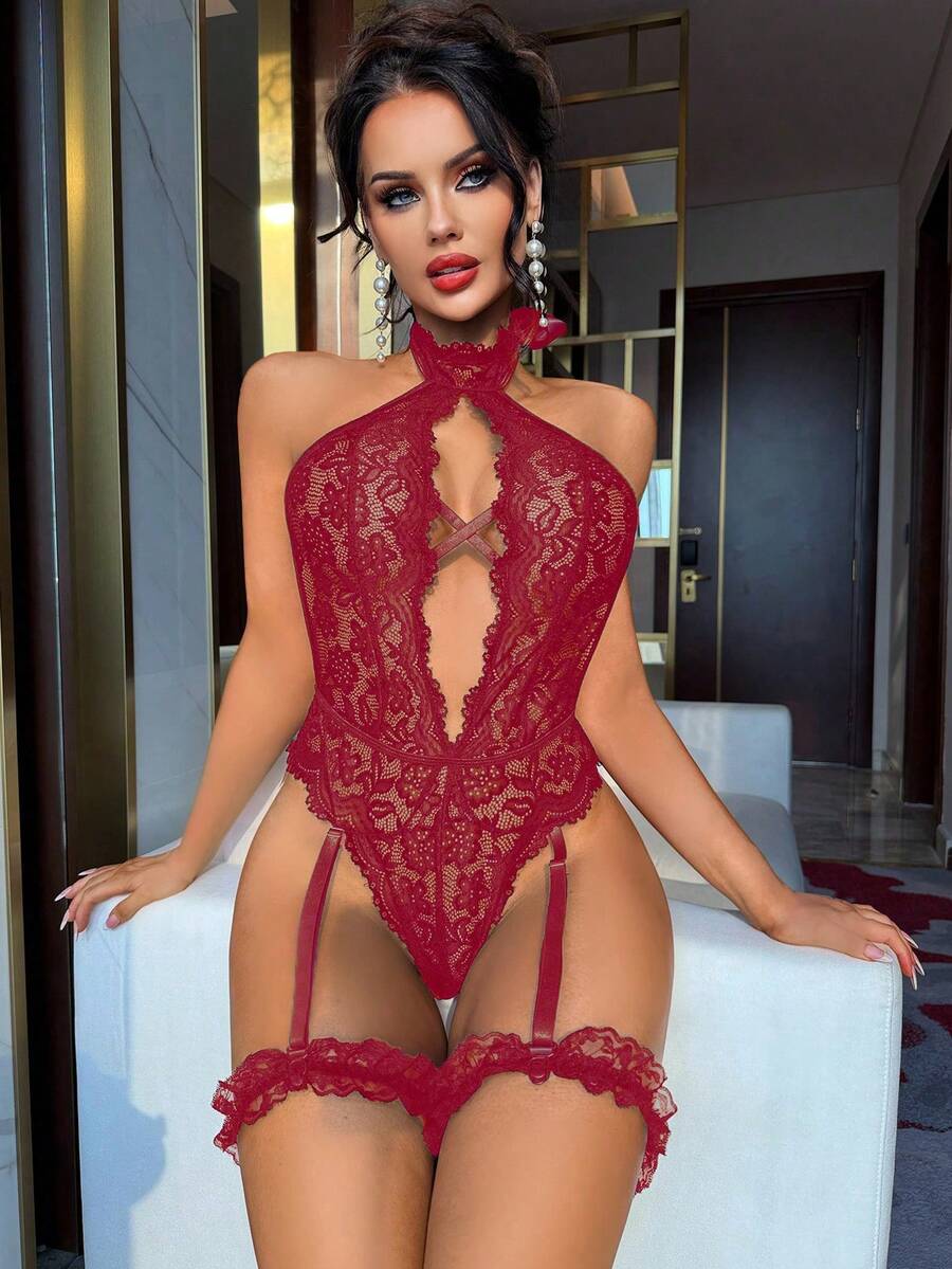 3pcs Lace Women's Bodysuits, Classic Sexy Wireless Jumpsuit Set [Jumpsuit 2 Leg Garters]
