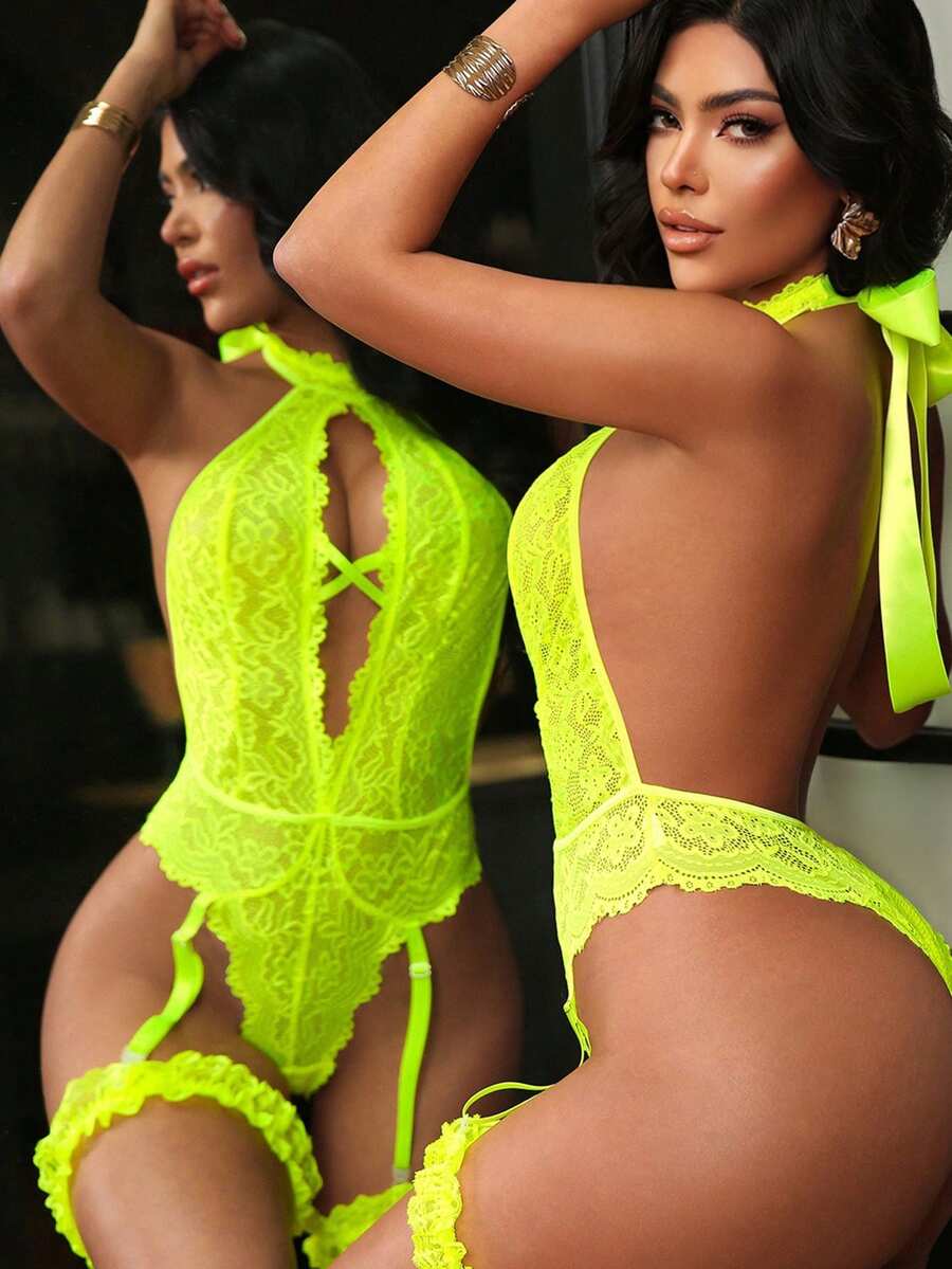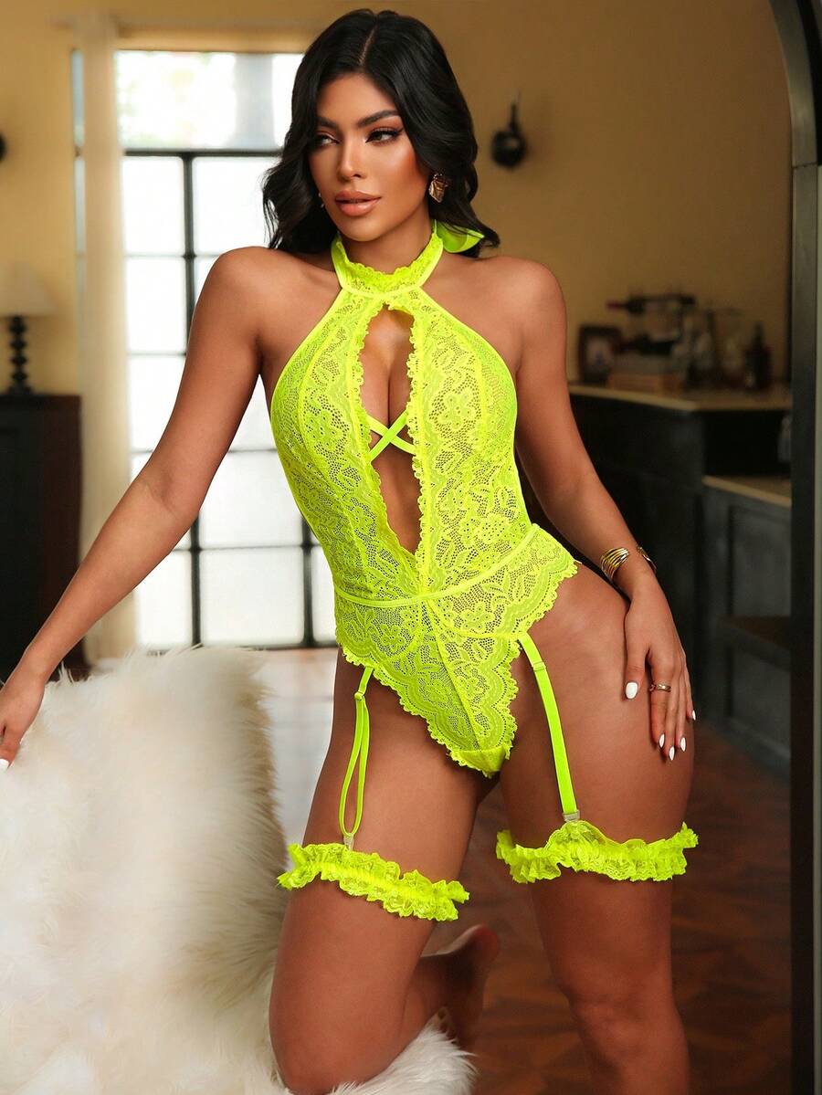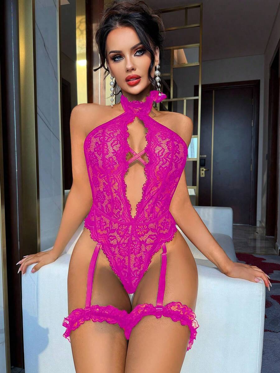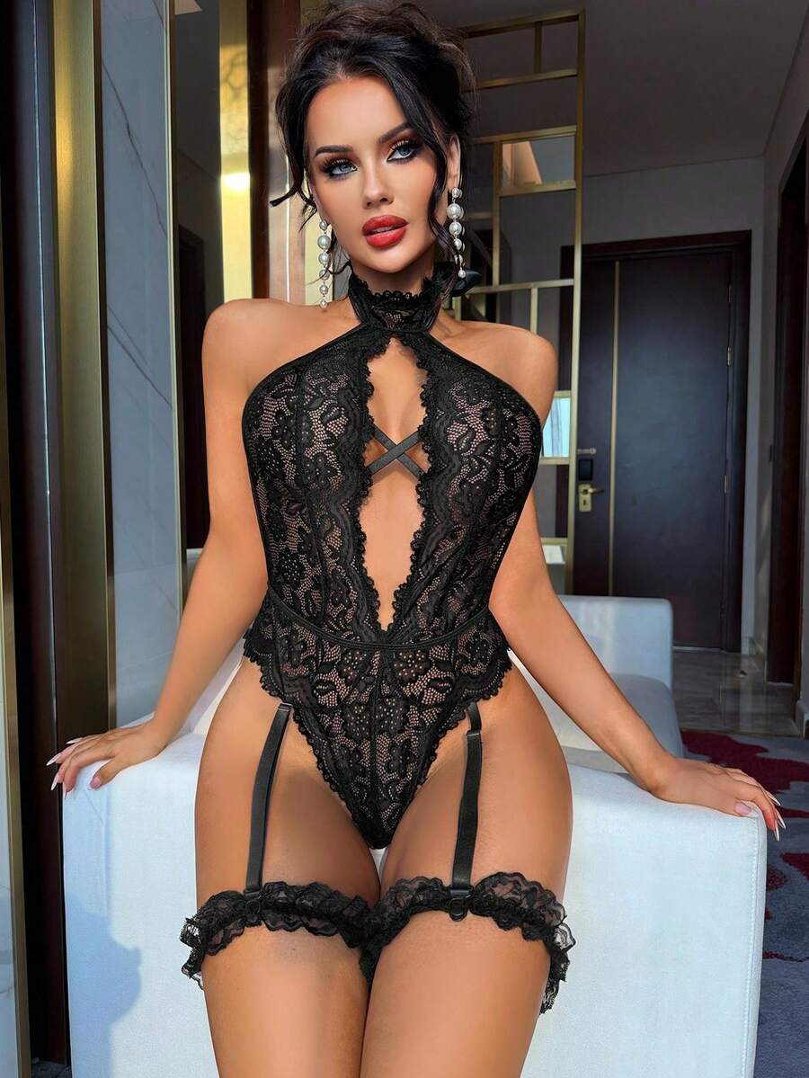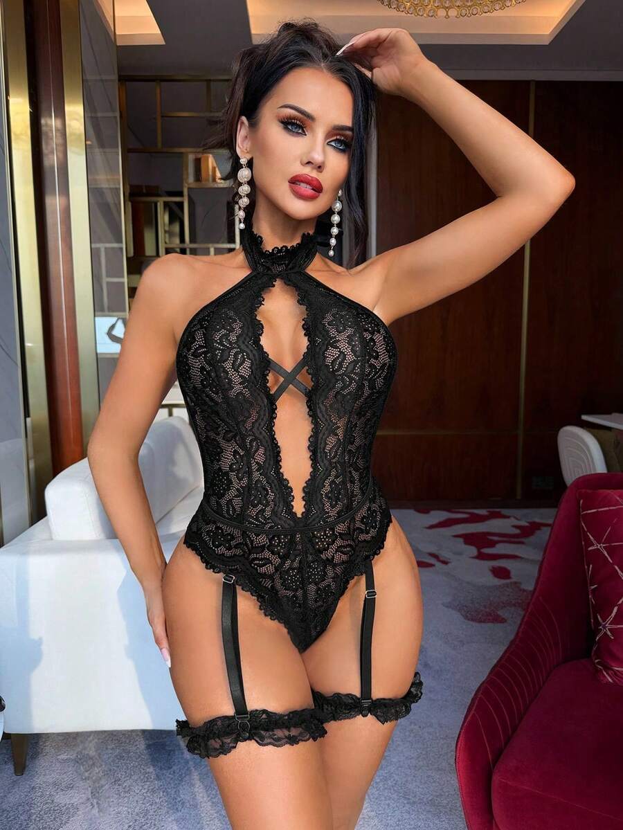 3pcs Set Women's Lace Jumpsuit, Classic Sexy Seamless Lingerie Wireless [Jumpsuit 2 Leg Garters]