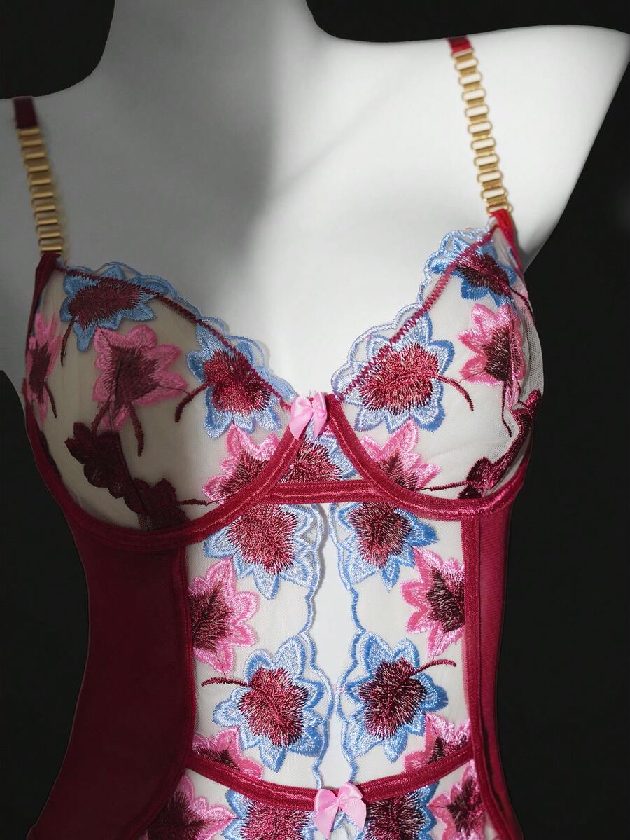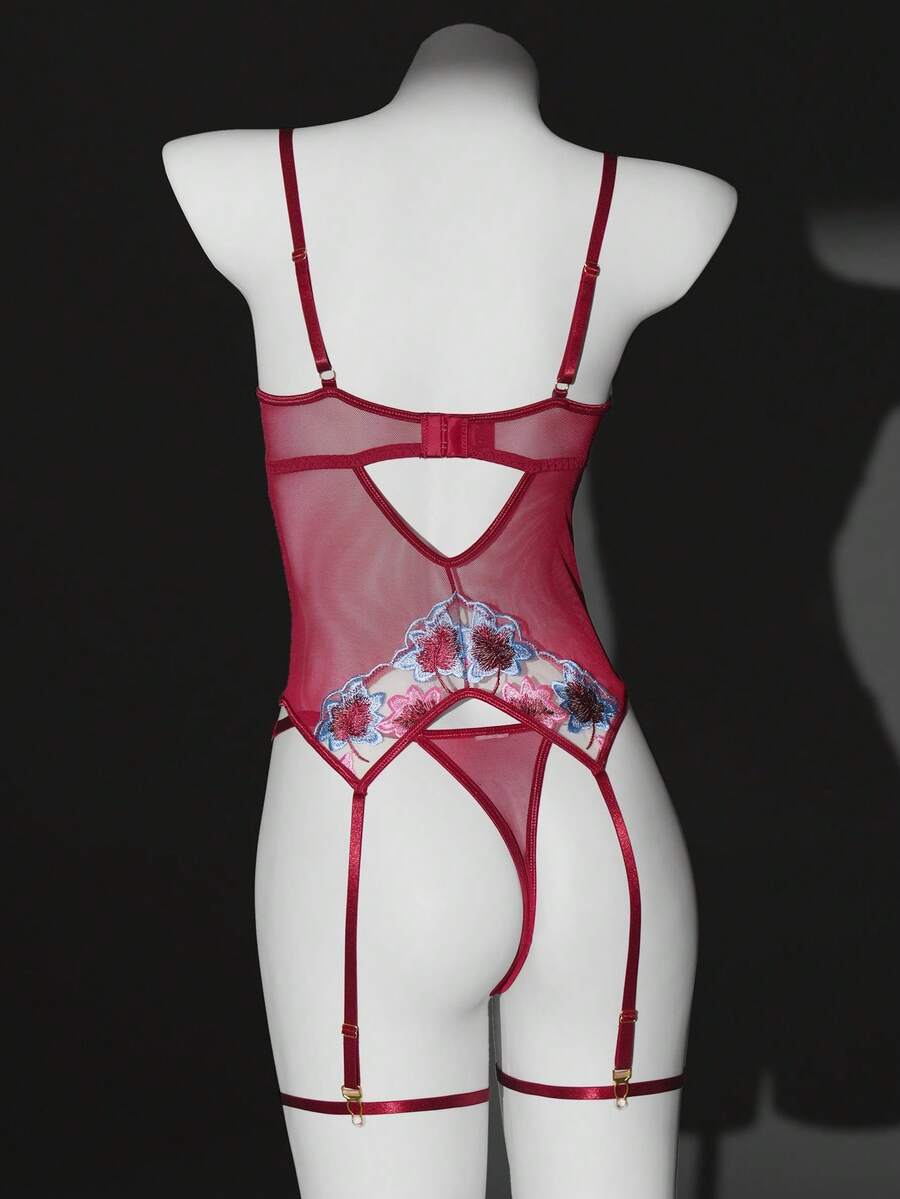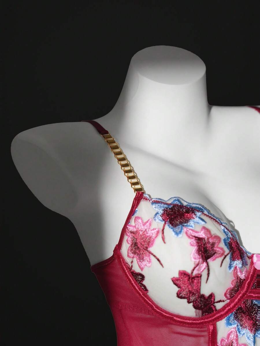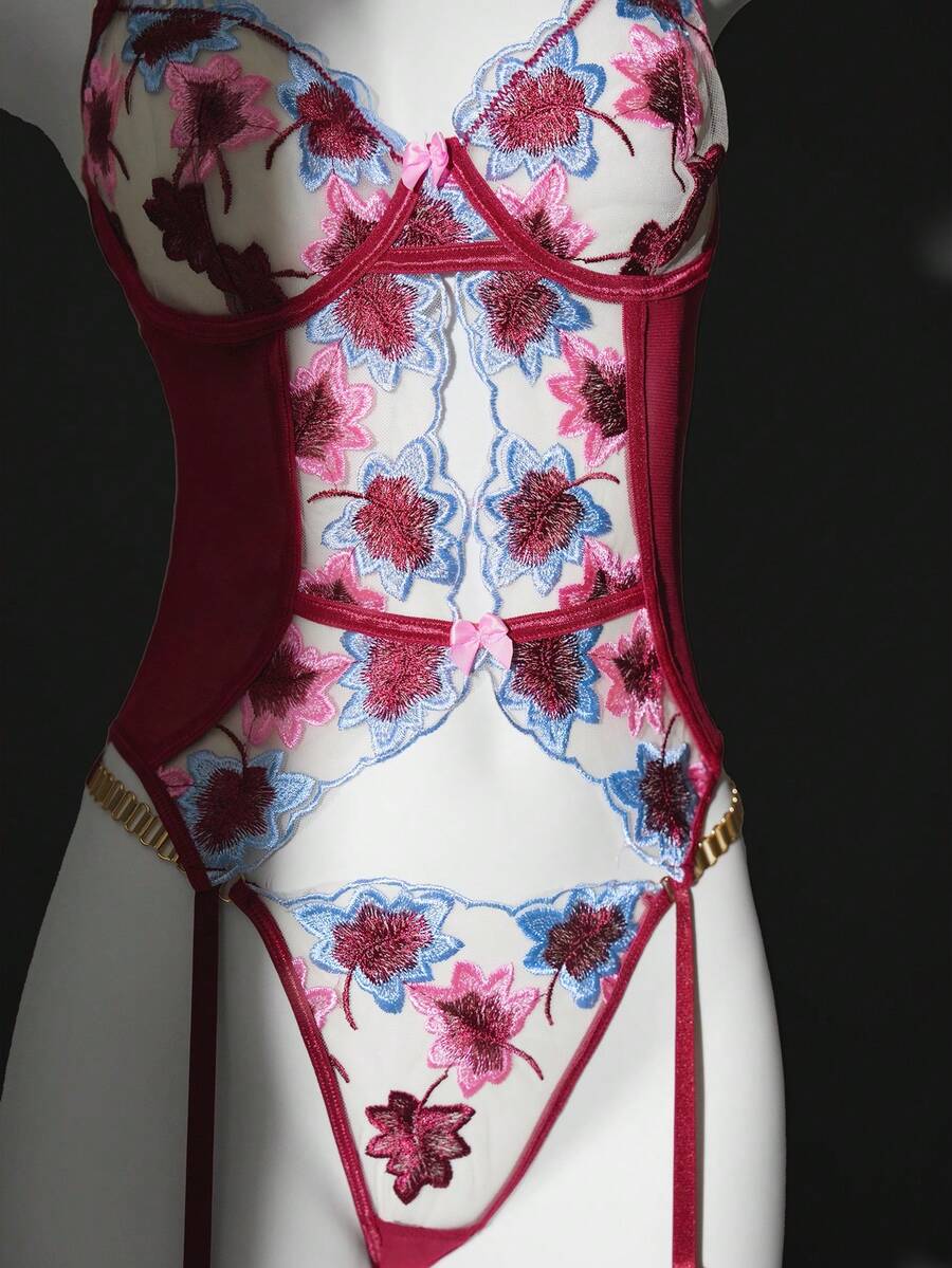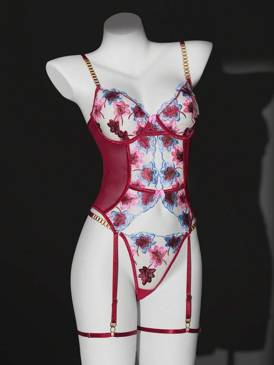 3pcs Sexy Lingerie Set For Women, Includes Lace Embroidered Maple Leaf Bra, Metal Chain Strap Bra, Thong, And Leg Garter