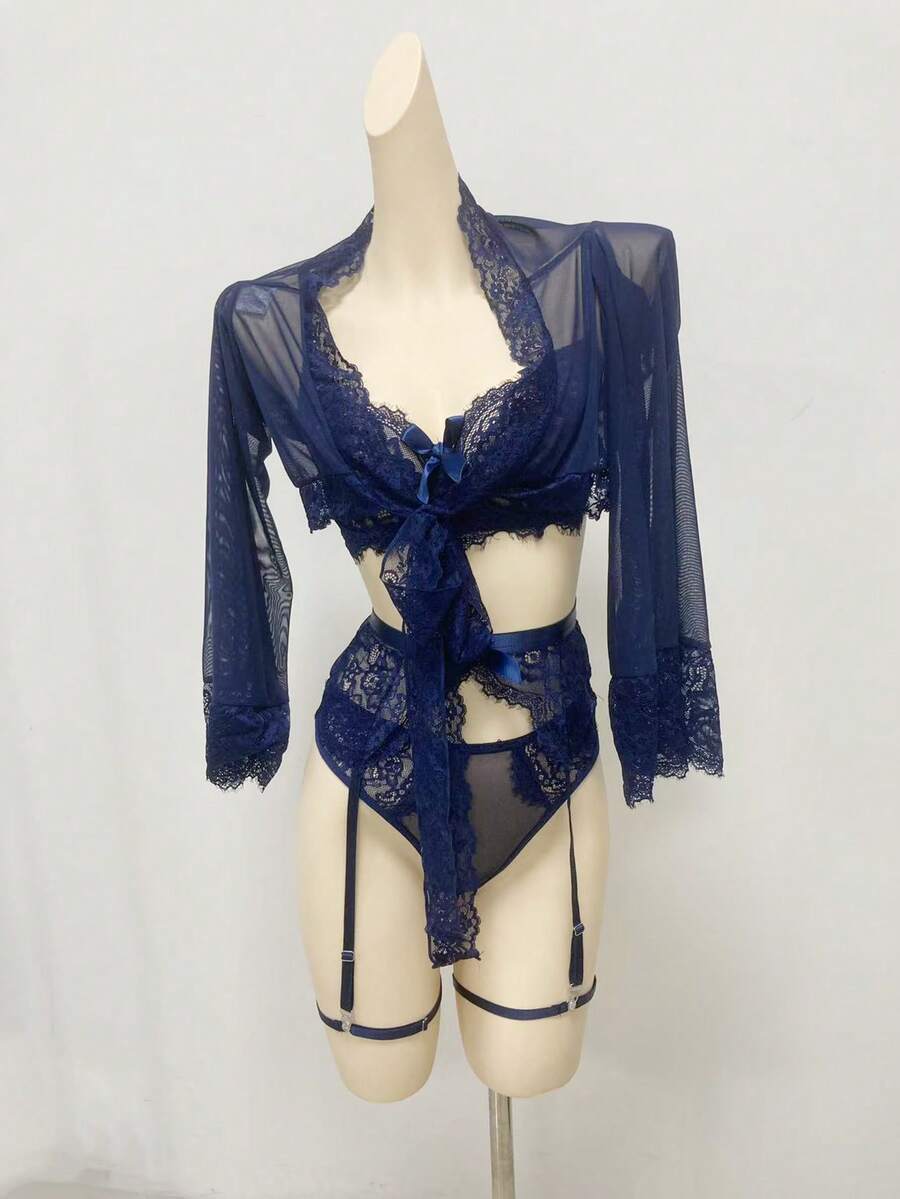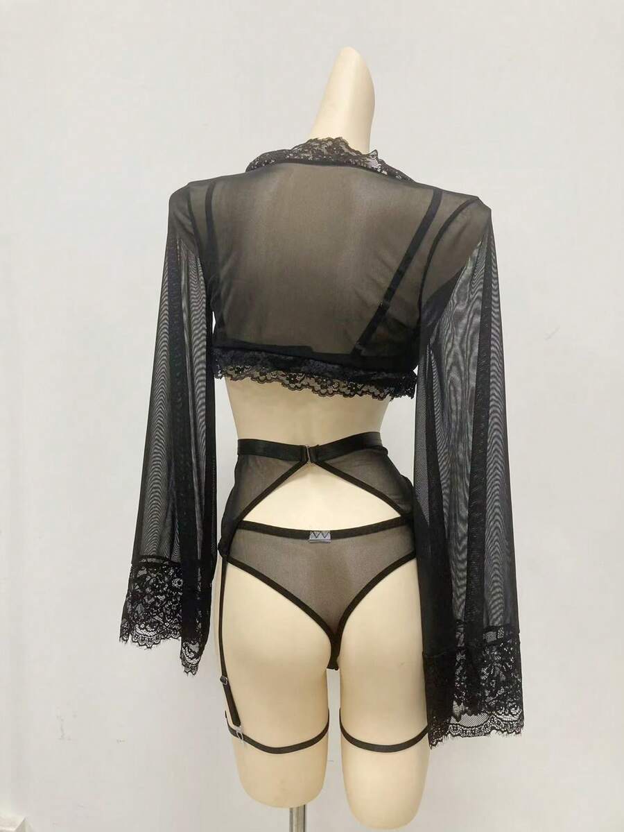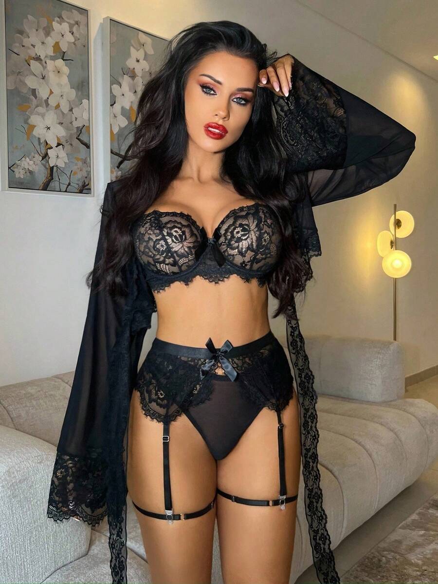 Mature, Elegant Gothic Style Slouchy Lace Splice Mesh Blouse G-String Garter Belt 2 Leg Rings Long Lace Tie Robe, 6-Piece Sexy Lingerie Set For Women