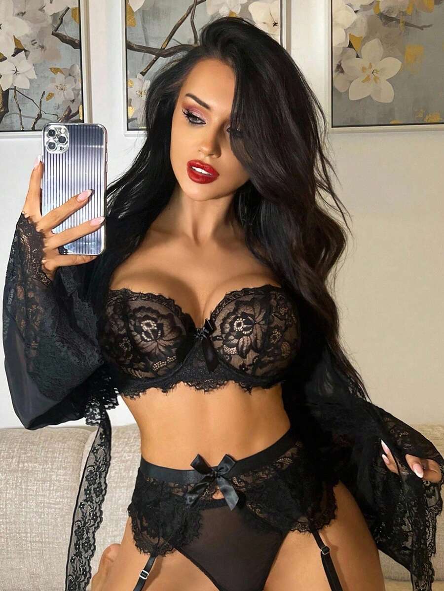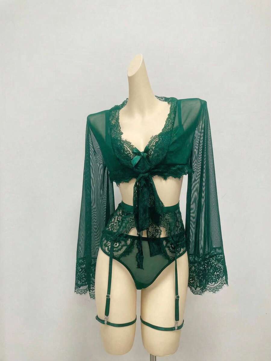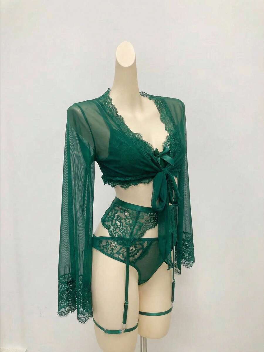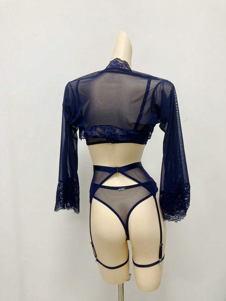 Mature, Elegant Gothic Style Slouchy Lace Splice Mesh Blouse G-String Garter Belt 2 Leg Rings Long Lace Tie Robe, 6-Piece Sexy Lingerie Set For Women