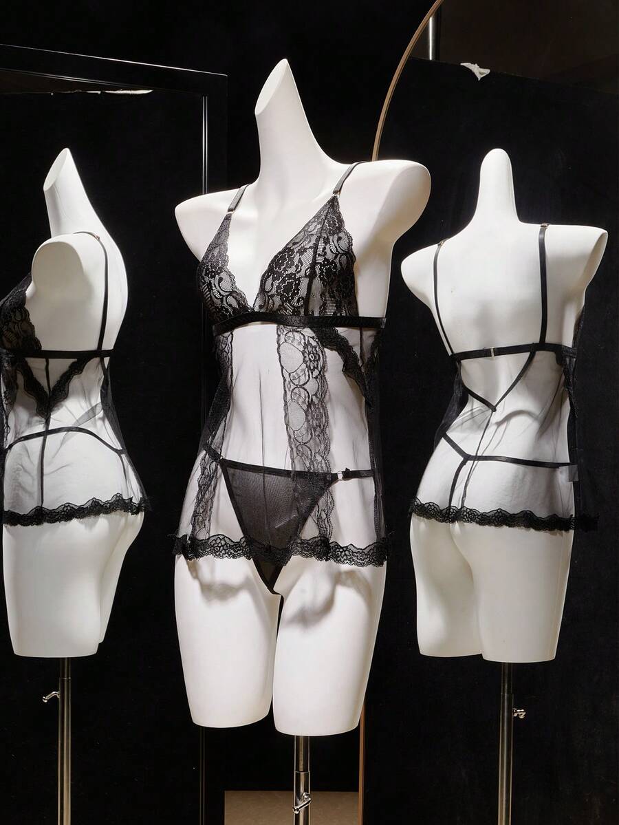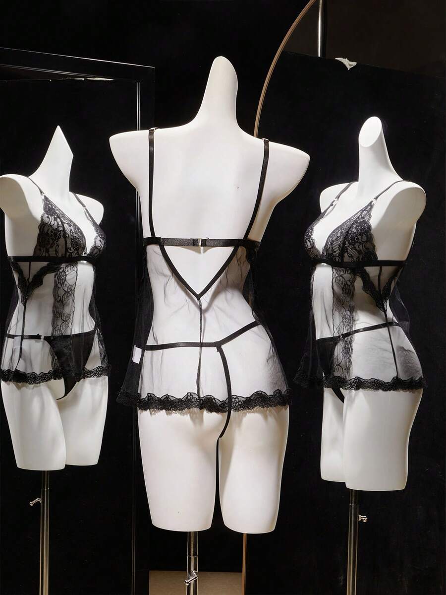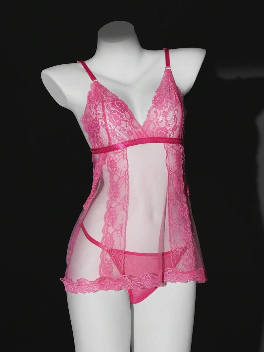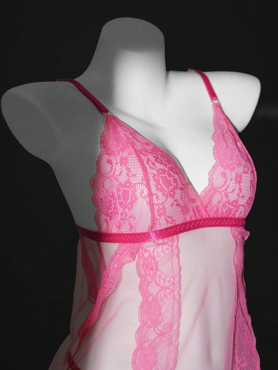Women Lace Patchwork Adjustable Strap Nightgown And Thong Lingerie Set, Sexy