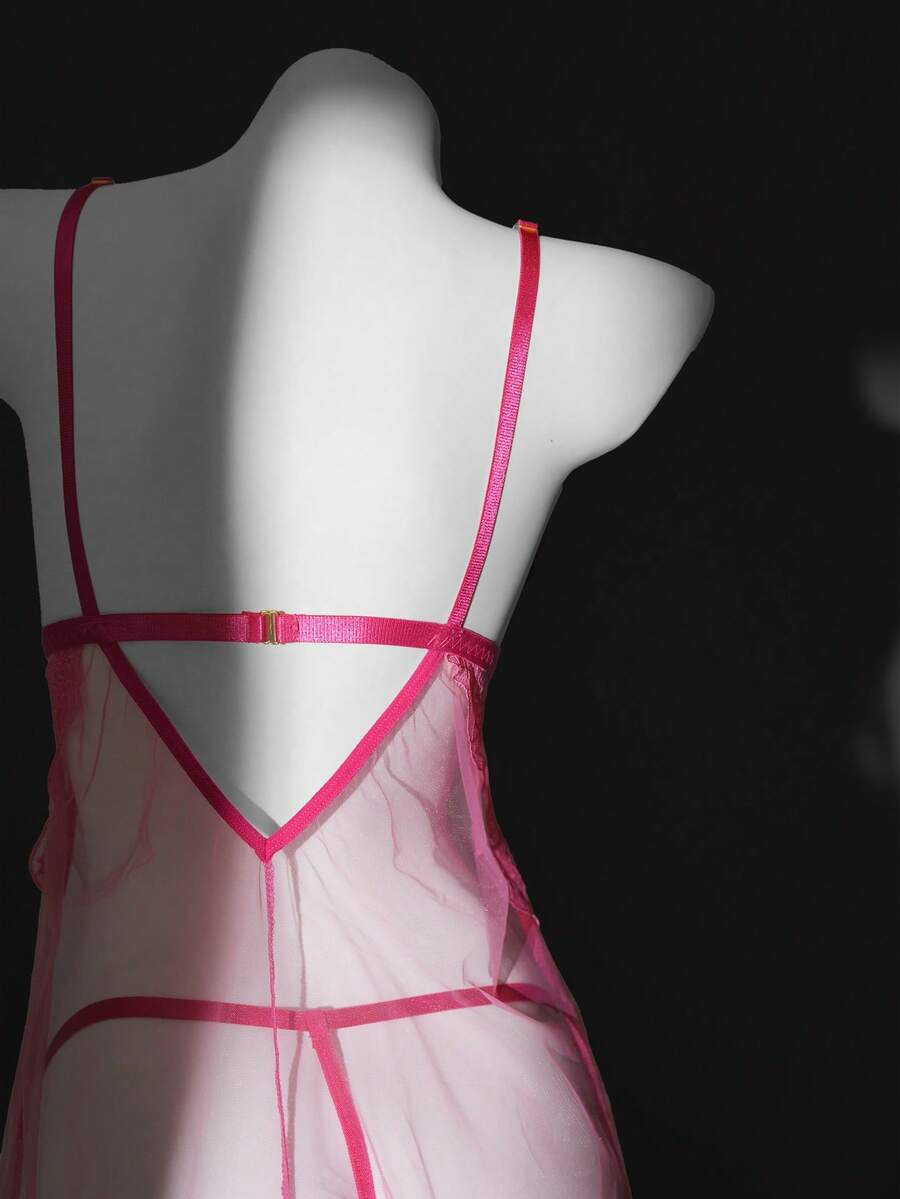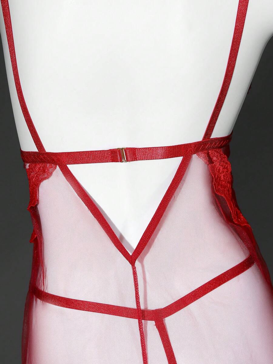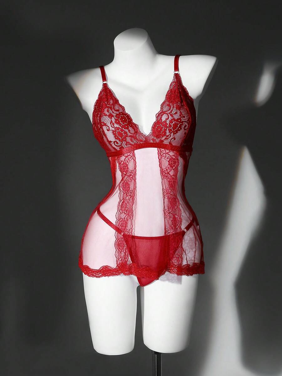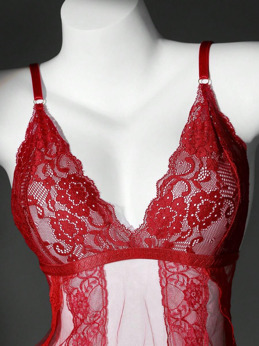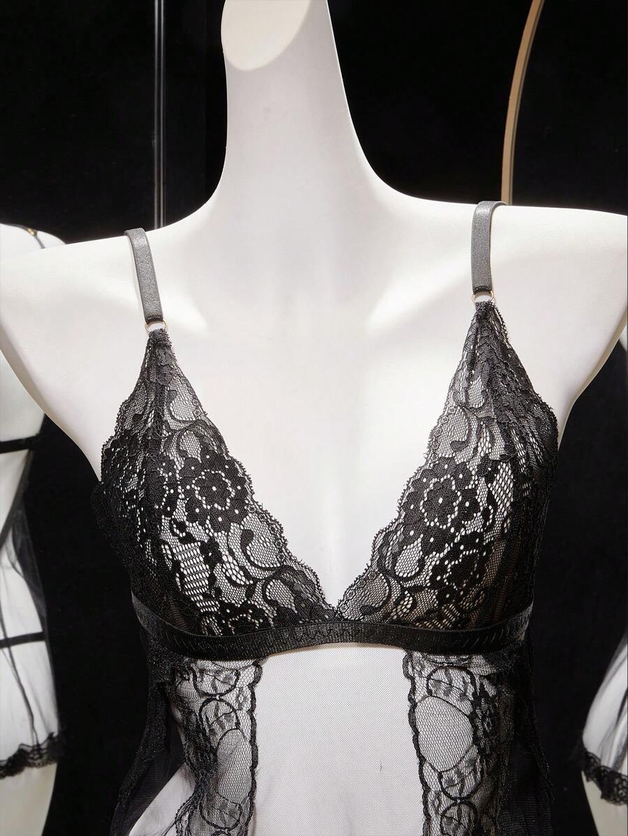 Women Lace Patchwork Adjustable Strap Nightgown And Thong Lingerie Set, Sexy